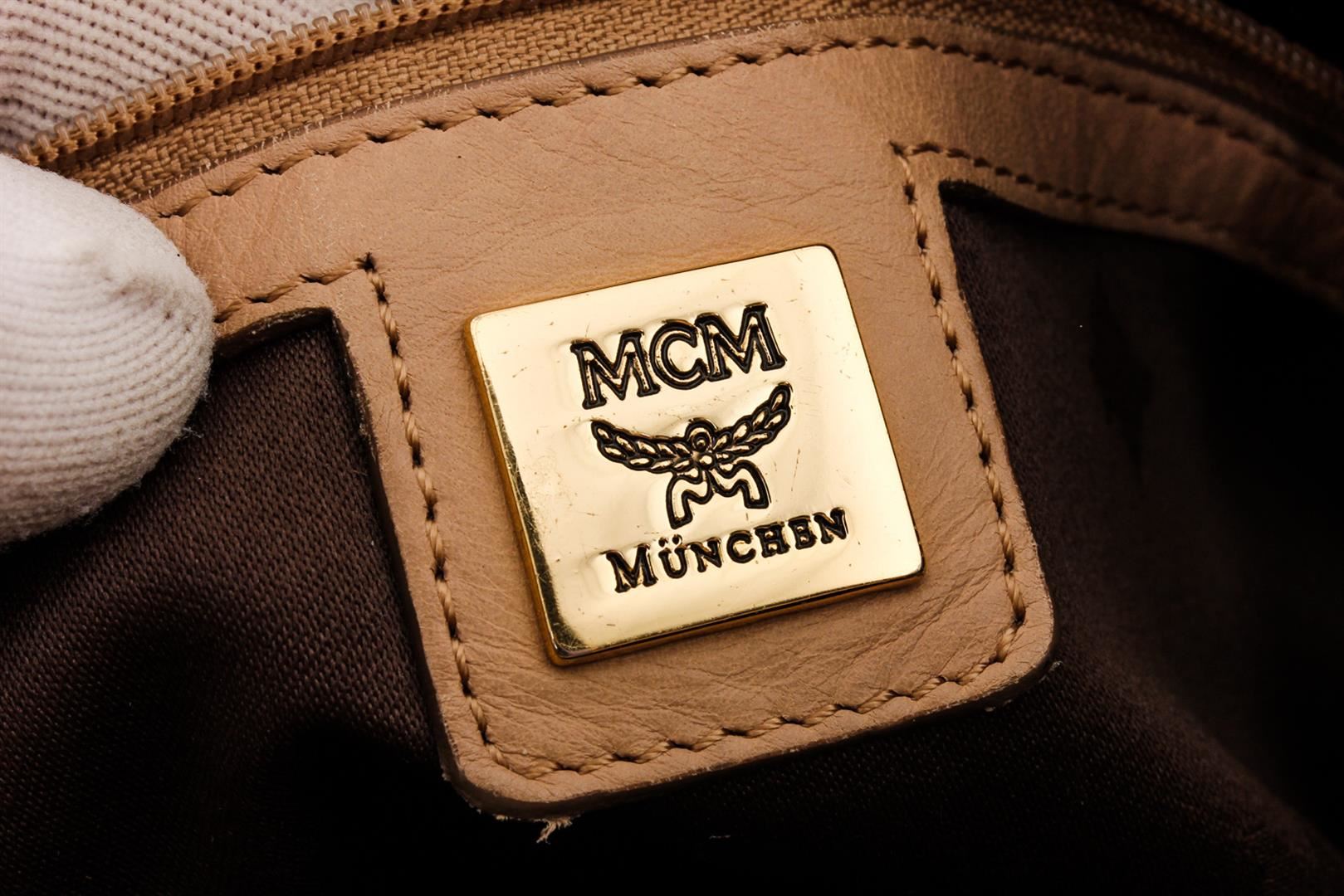 MCM cream coated canvas Visetos Hobo shoulder bag with gold-tone hardware, single flat leather shoulder strap, protective feet at base, brown logo canvas lining, three interior pockets, one with zip closure and overall zip closure at top.