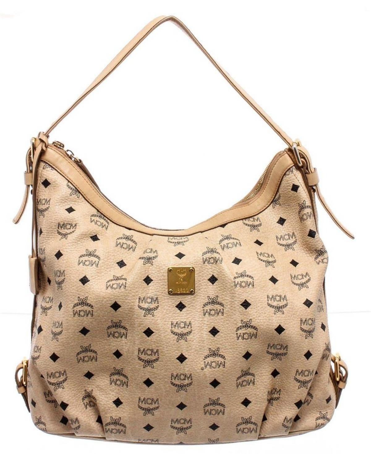 MCM cream coated canvas Visetos Hobo shoulder bag with gold-tone hardware, single flat leather shoulder strap, protective feet at base, brown logo canvas lining, three interior pockets, one with zip closure and overall zip closure at top. Measurements: Length: 17.95 in / 46 cm Width: 6.45 in / 16 cm 11.95 in / 30 cmCONDITION: Pre-Owned Good overall, please see photographs for detail.