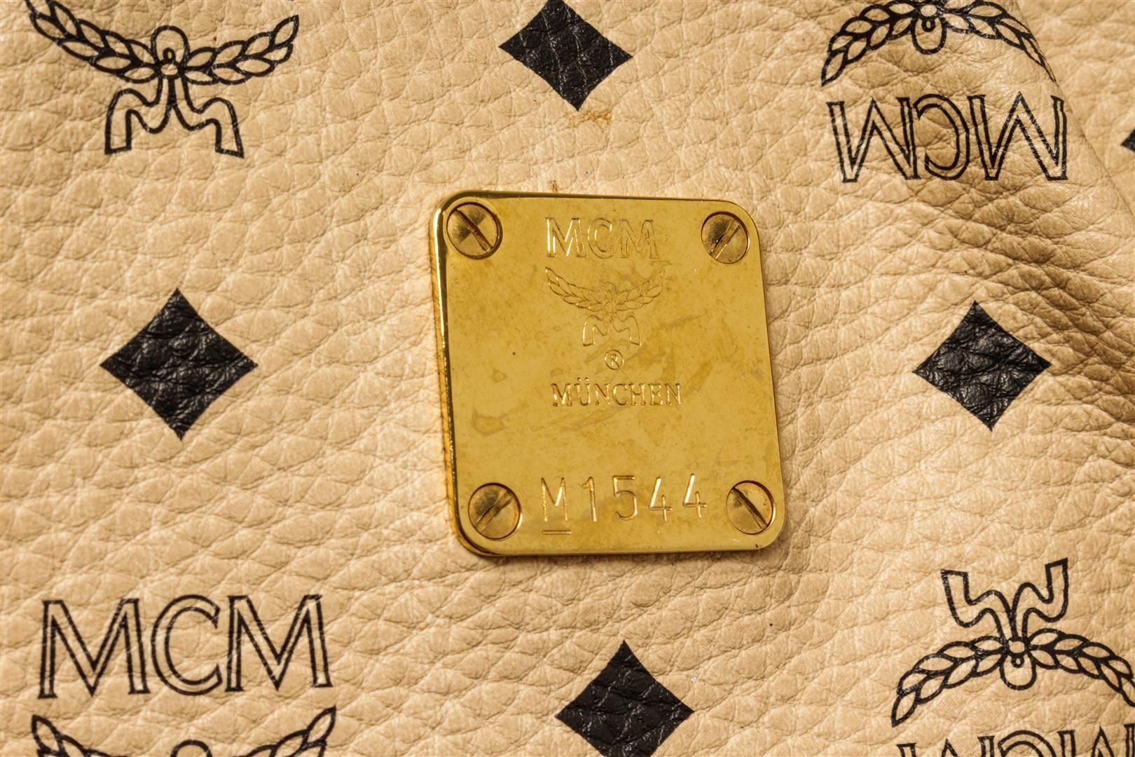 One MCM Cream Coated Canvas Visetos Hobo bag. Item is sold AS-IS. All available information is listed in the description and shown in the photo. mcm cream coated canvas visetos hobo shoulder bag with gold-tone hardware, single flat leather shoulder strap, protective feet at base, brown logo canvas lining, three interior pockets, one with zip closure and overall zip closure at top. 17.95"L x 6.45"W x 11.95"H / 45.59 X 16.38 X 30.35 cm