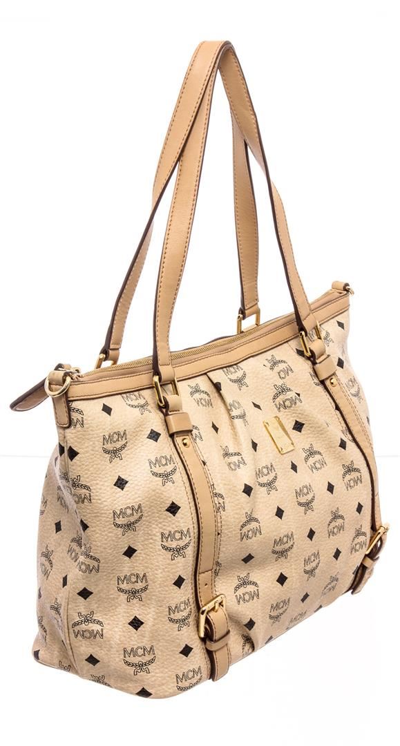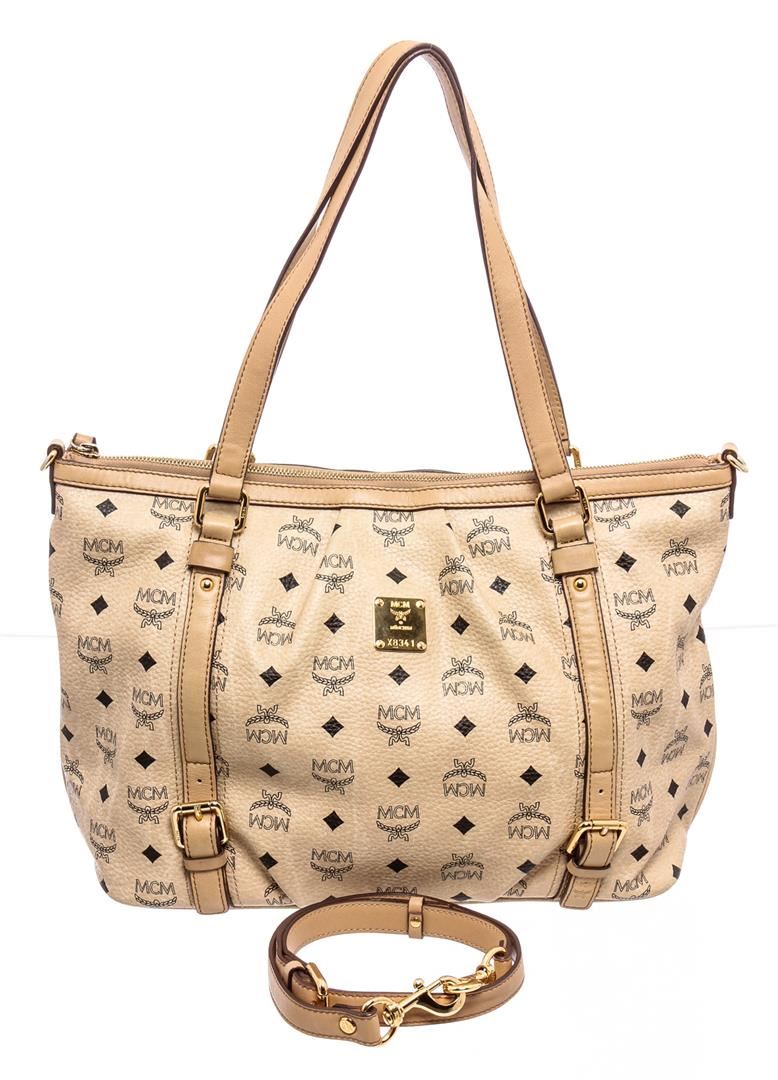 MCM cream coated canvas Visetos medium tote bag with gold-tone hardware, optional detachable leather shoulder strap, dual flat top handles, brown logo canvas lining, three interior pockets; one with zip closure and overall zip closure at top.