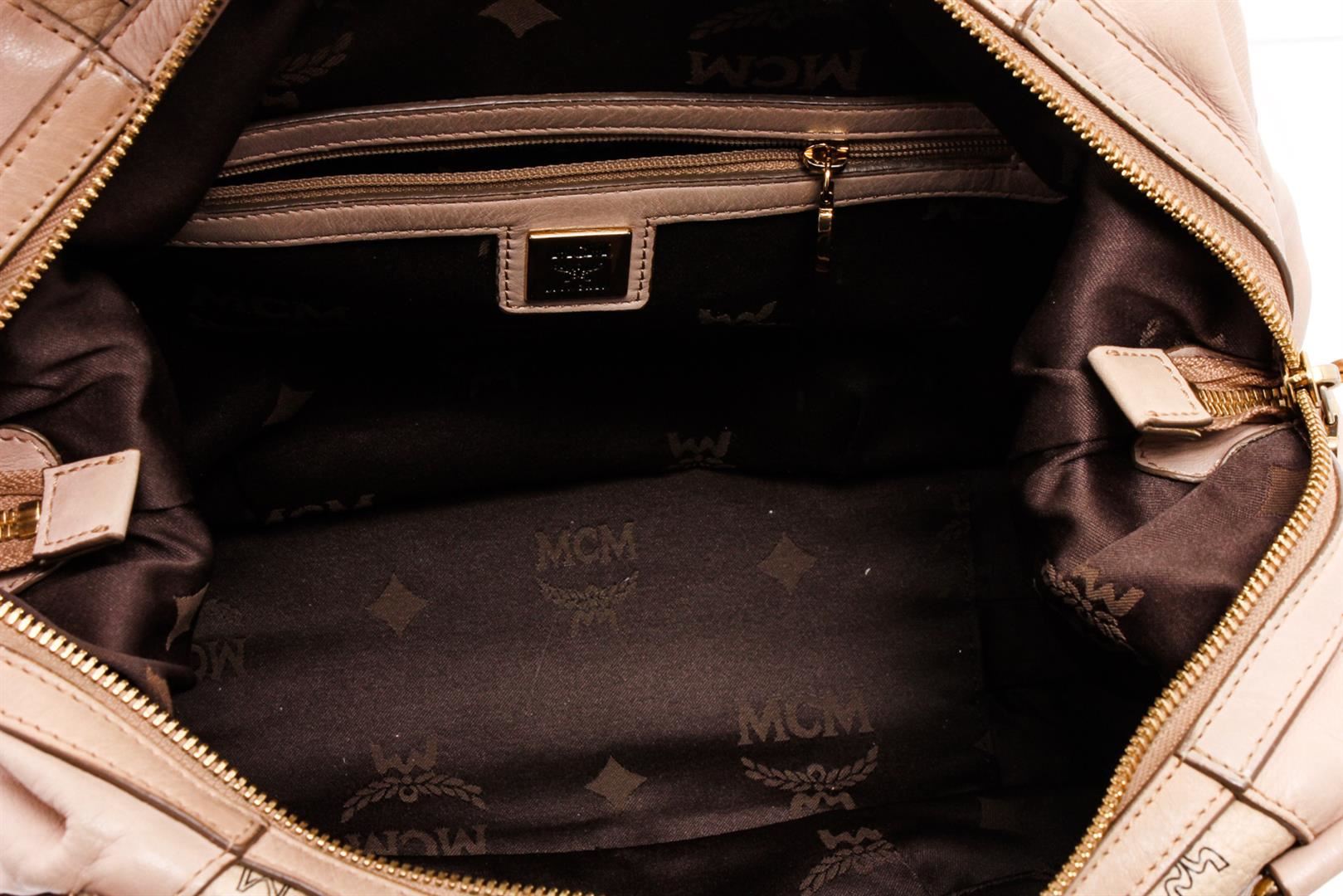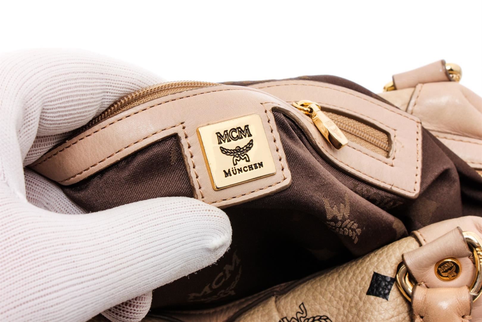 MCM cream coated canvas Visetos shoulder bag with gold-tone hardware, dual rolled top handles, protective feet at base, brown logo woven lining, three interior pockets, one with zip closure and overall zip closure at top.