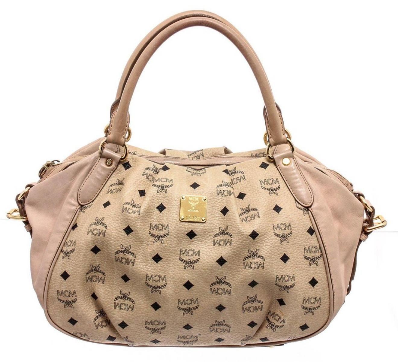 MCM cream coated canvas Visetos shoulder bag with gold-tone hardware, dual rolled top handles, protective feet at base, brown logo woven lining, three interior pockets, one with zip closure and overall zip closure at top.         Measurements:  Length: 13 in / 33 cm  Width: 5 in / 13 cm  10 in / 25 cmCONDITION: Pre-Owned Good overall, please see photographs for detail.