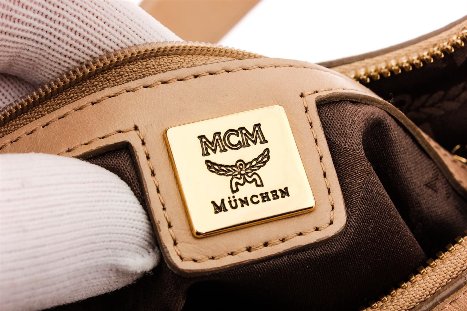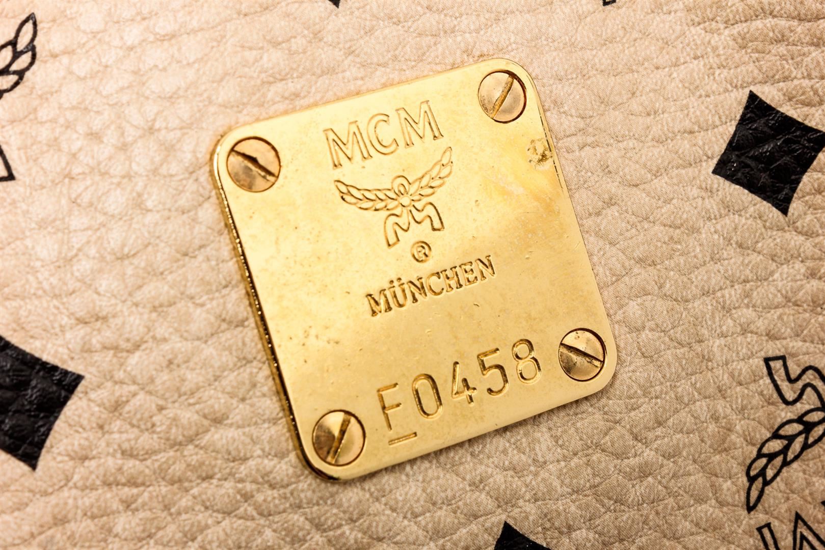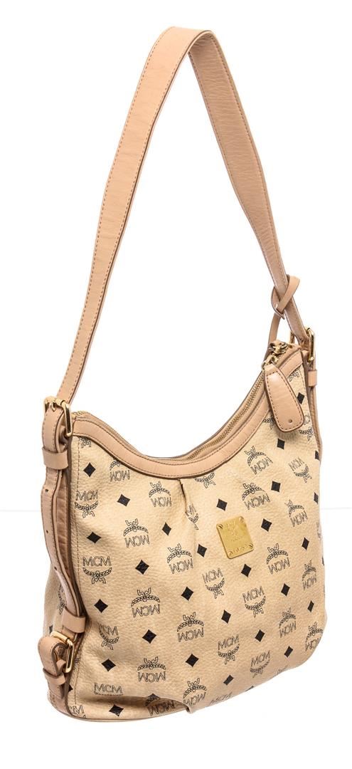 Cream Visetos MCM coated canvas and leather trim medium crossbody bag with gold-tone hardware, single flat handle, brown canvas lining, one zip pocket at interior wall and zip top closure at top.
