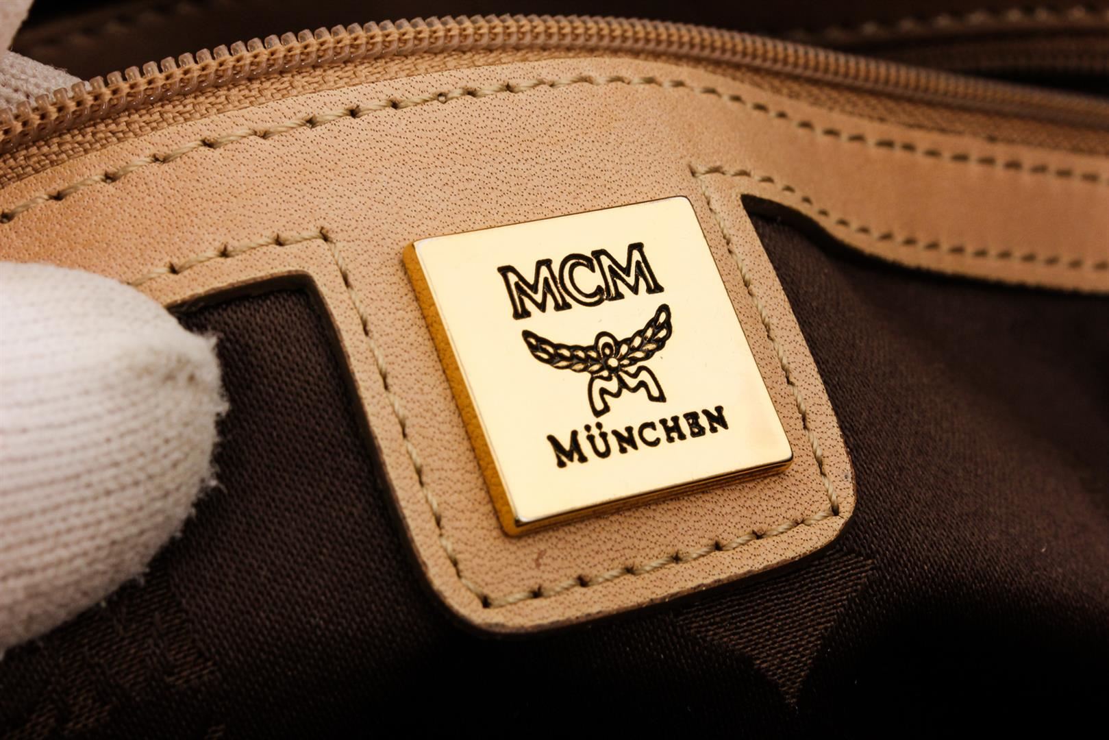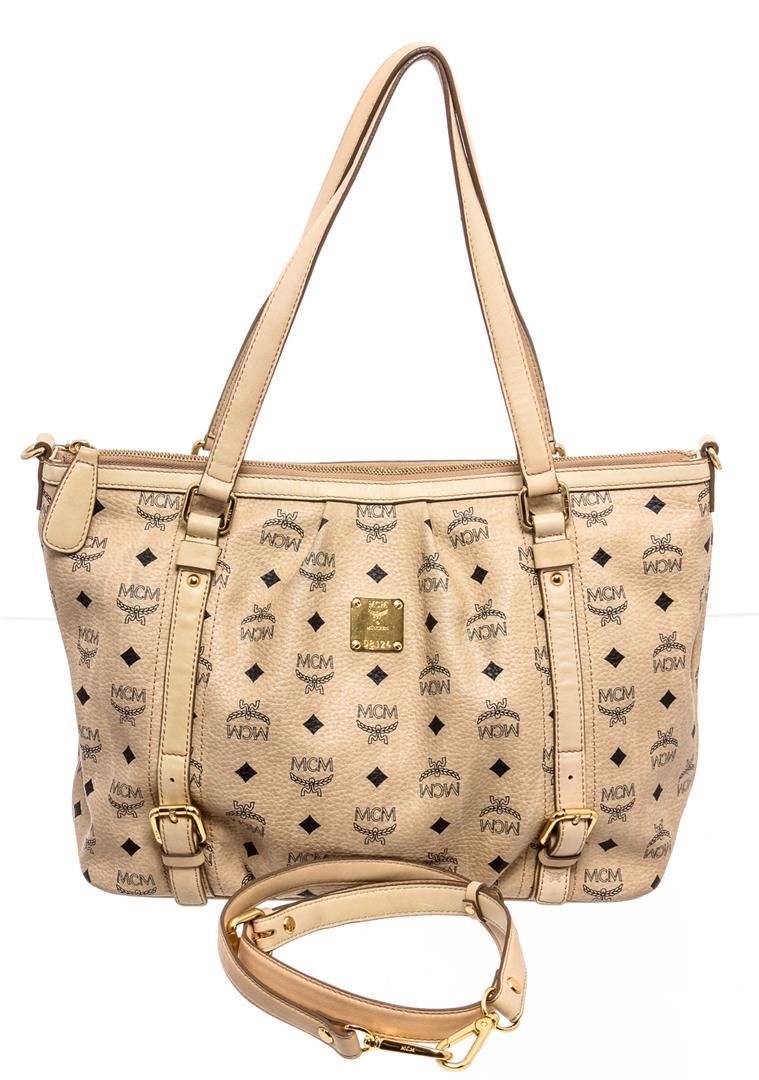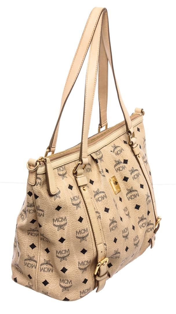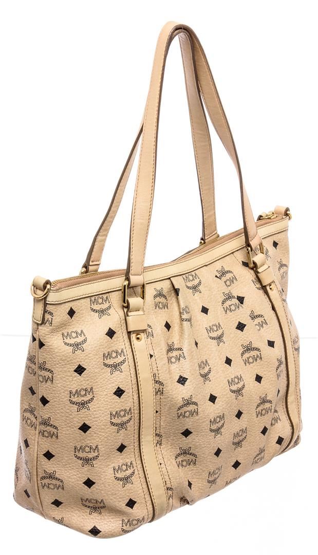 Cream Visetos MCM coated canvas and leather trim medium satchel tote bag with gold-tone hardware, dual flat handles, brown canvas lining, one zip pocket at interior wall and zip top closure at top.