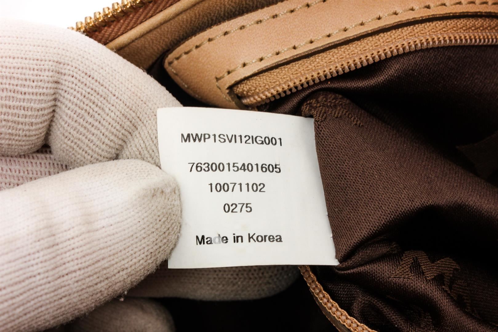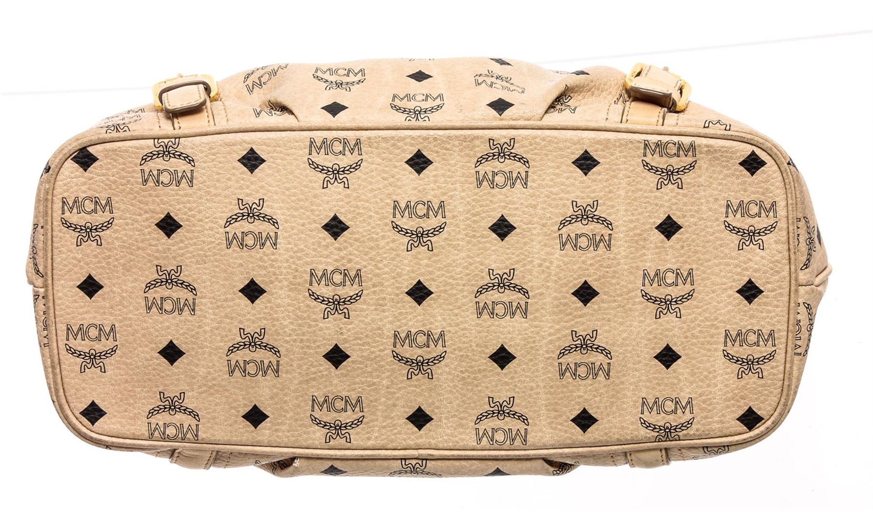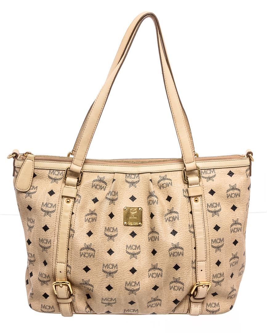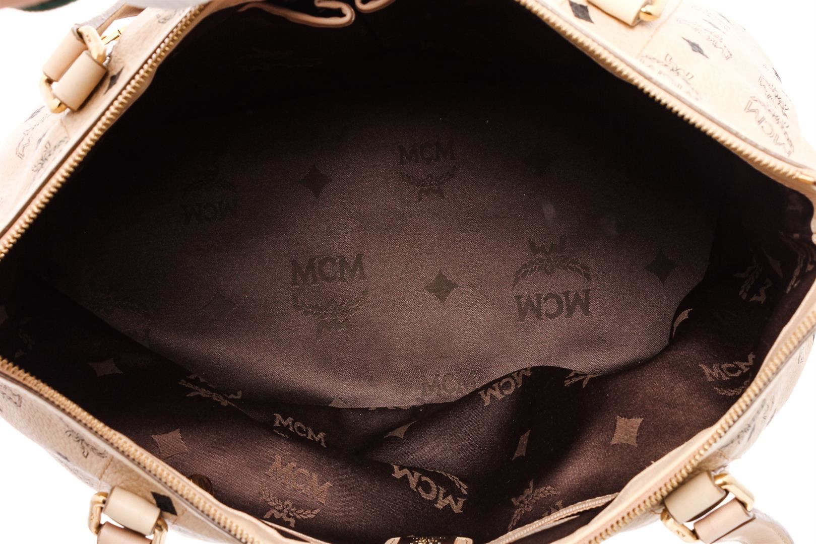 Cream Visetos MCM coated canvas and leather trim medium satchel tote bag with gold-tone hardware, dual flat handles, brown canvas lining, one zip pocket at interior wall and zip top closure at top.