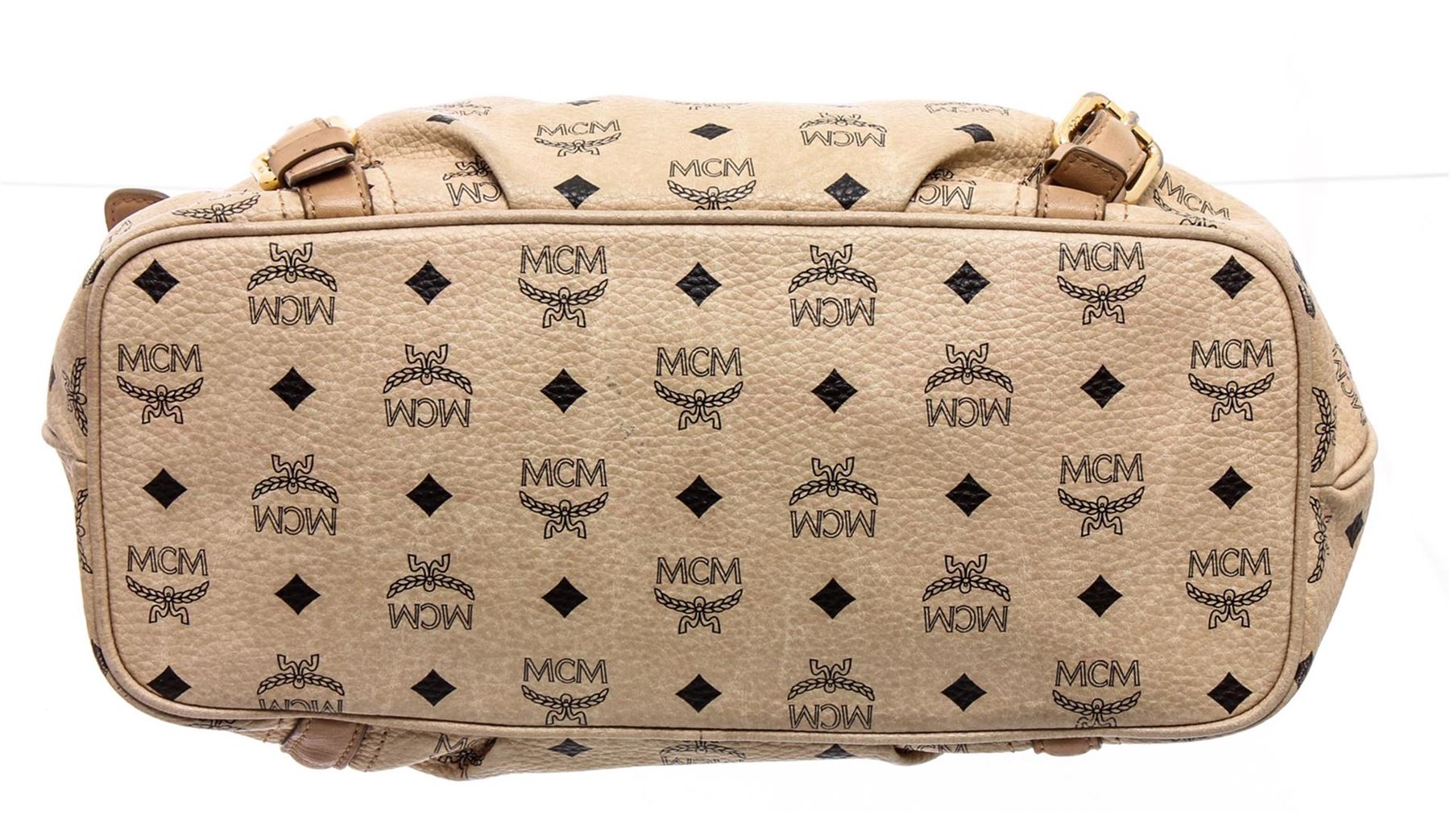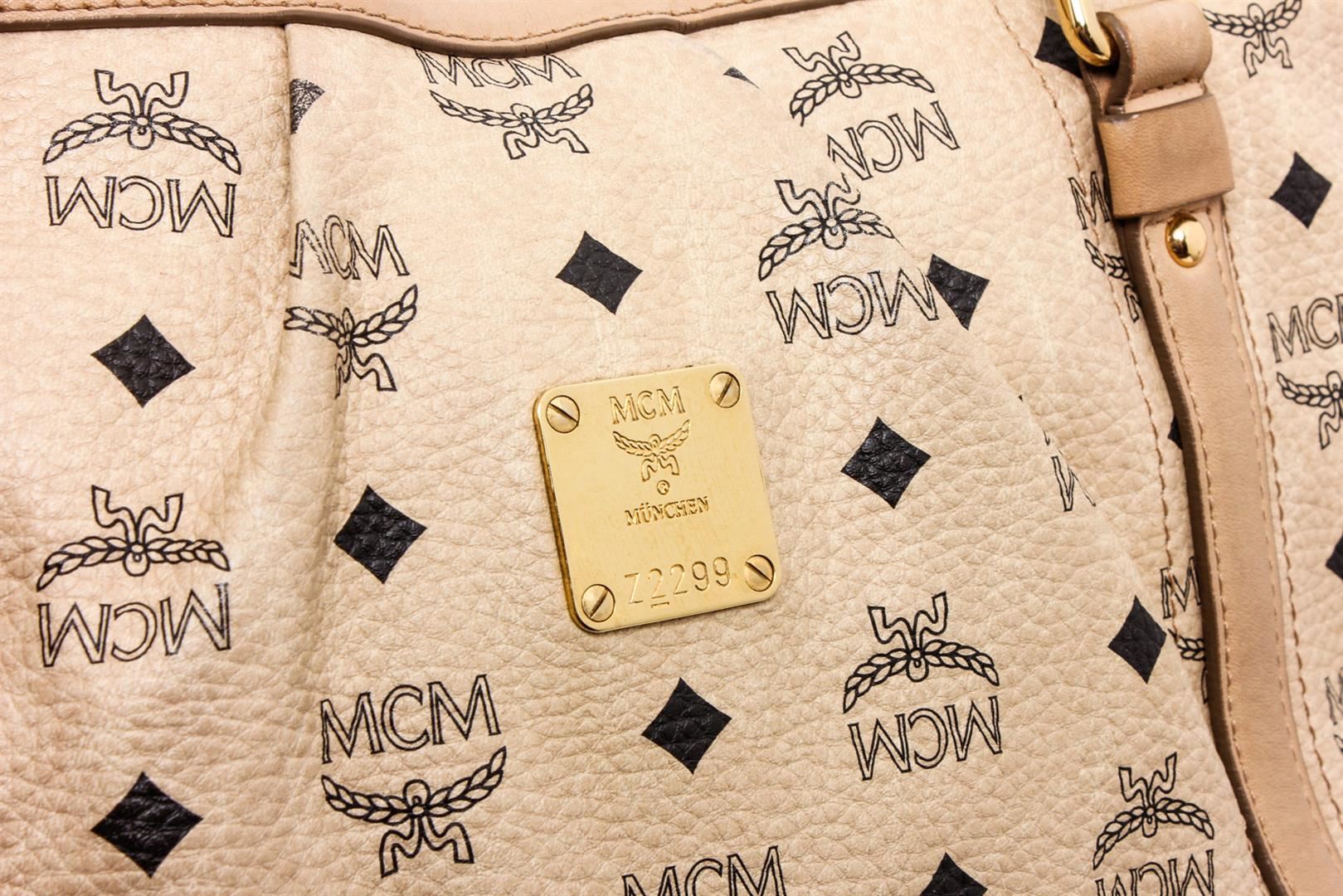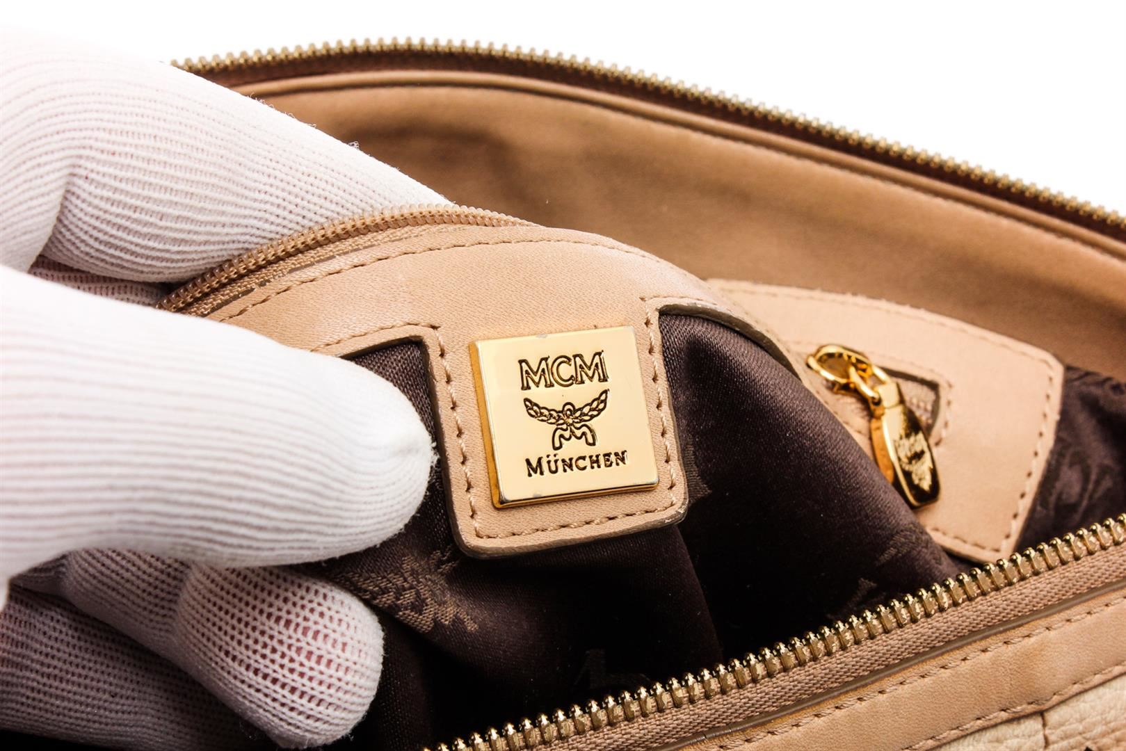 Cream Visetos MCM coated canvas and leather trim medium satchel tote bag with gold-tone hardware, dual flat handles, brown canvas lining, one zip pocket at interior wall and zip top closure at top.