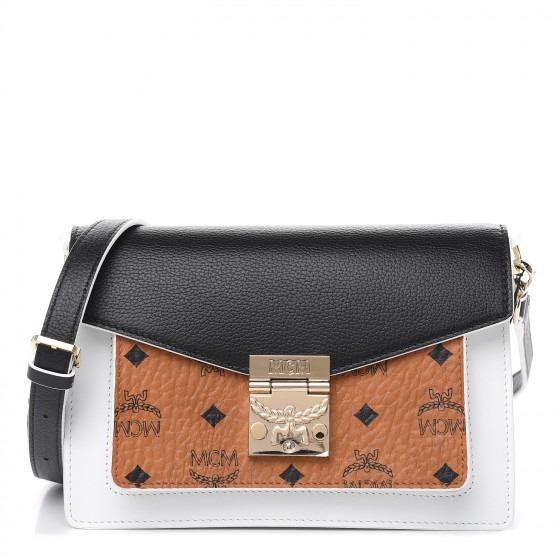 Cognac / Black handbag is finely crafted of visetos print coated canvas with MCM monogram and a V-shaped black calfskin leather flap. The shoulder bag features an optional adjustable leather shoulder strap and a polished brass press lock. The flap opens to a partitioned microfiber interior with a zipper pocket. This is the perfect messenger bag