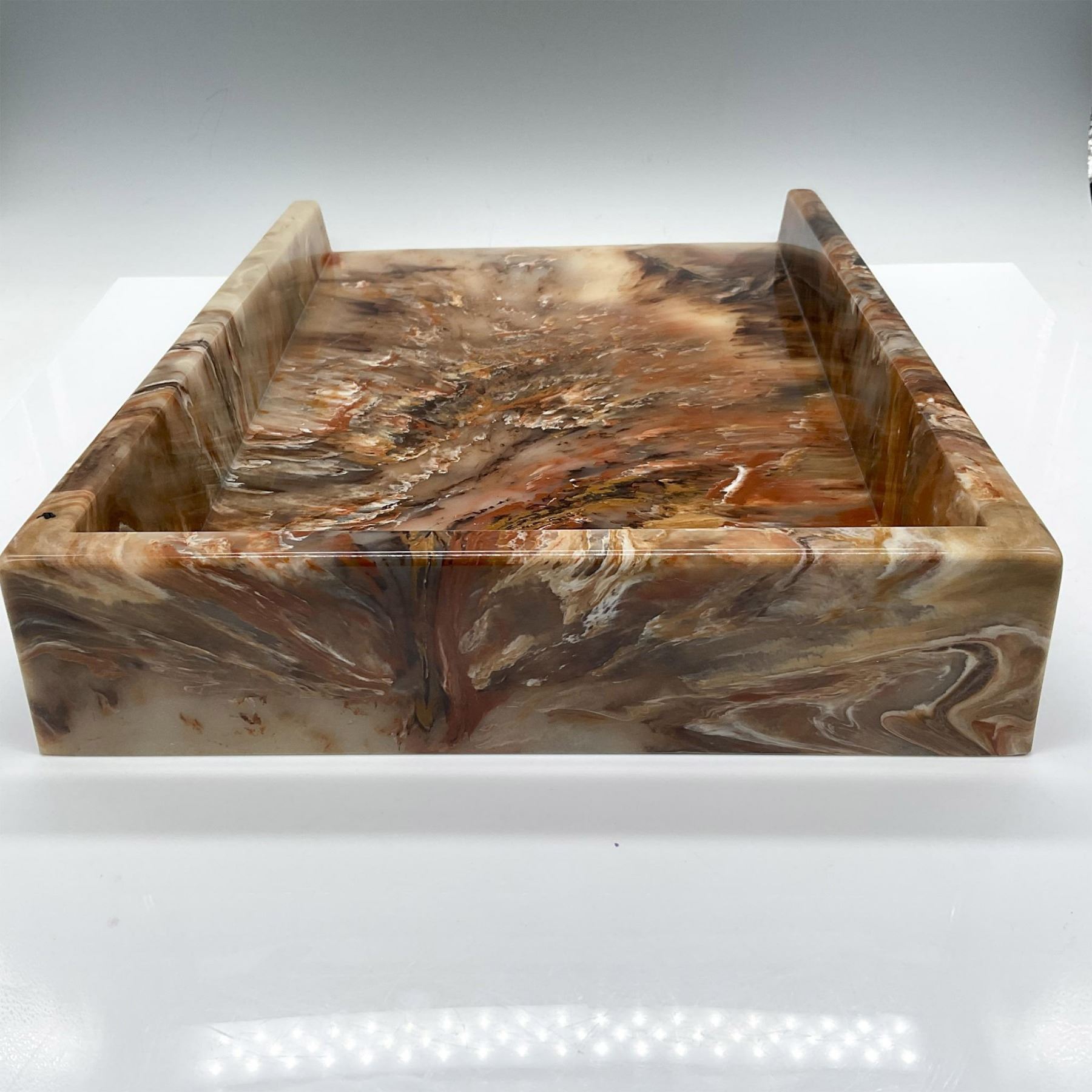 Heavy resin designed as onyx creating a sleek contemporary look. Blended colors of brown, rust, white and cream.