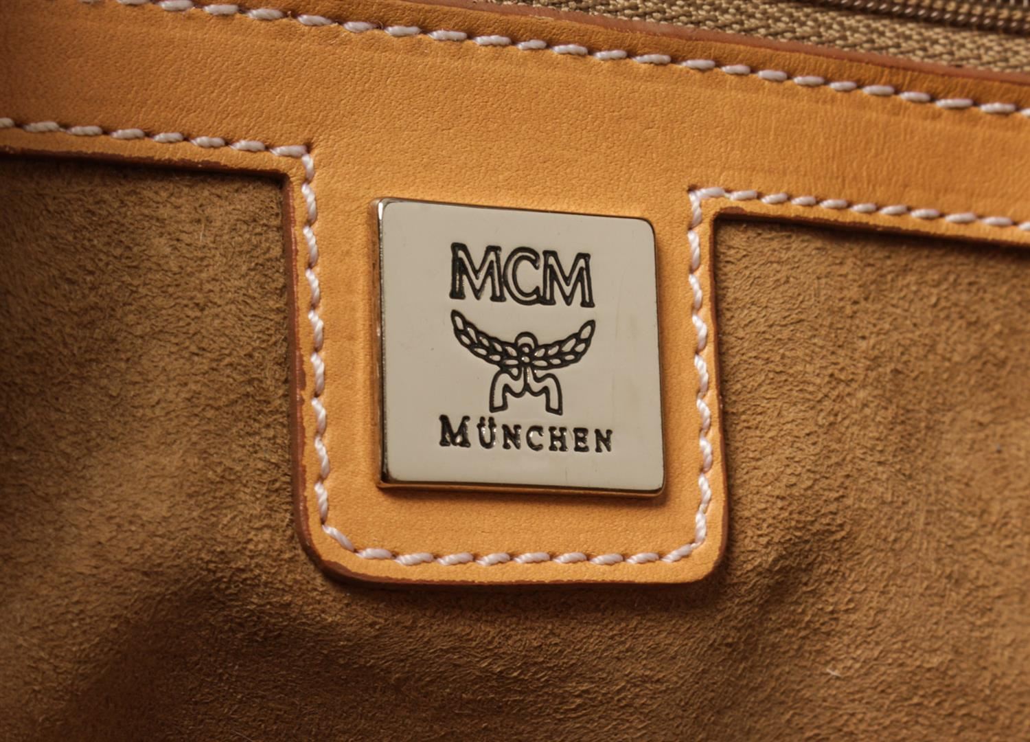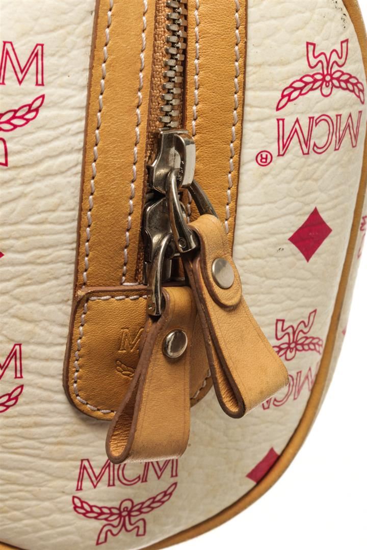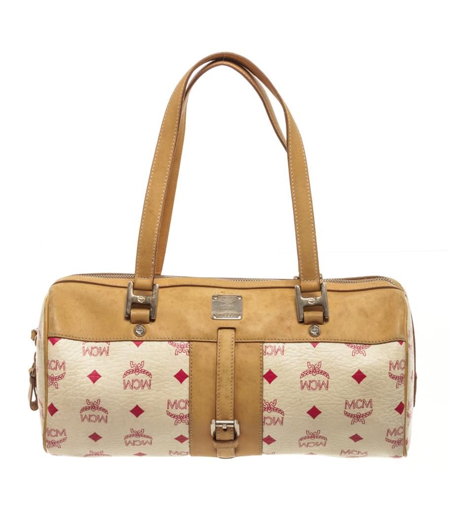 One MCM Duffle Mini In White/Tan Coated Canvas Shoulder Bag. Item is sold AS-IS. All available information is listed in the description and shown in the photo. MCM Duffle Mini In White/Tan Coated Canvas Shoulder Bag with shoulder strap, silver hardware, suede lining, two slip pockets, zip closure. There are some stains on the lining and light brown. Please refer to photos. 5.6"L x 11.9"W x 3.2"H / 14.22 x 30.22 x 8.12 cm