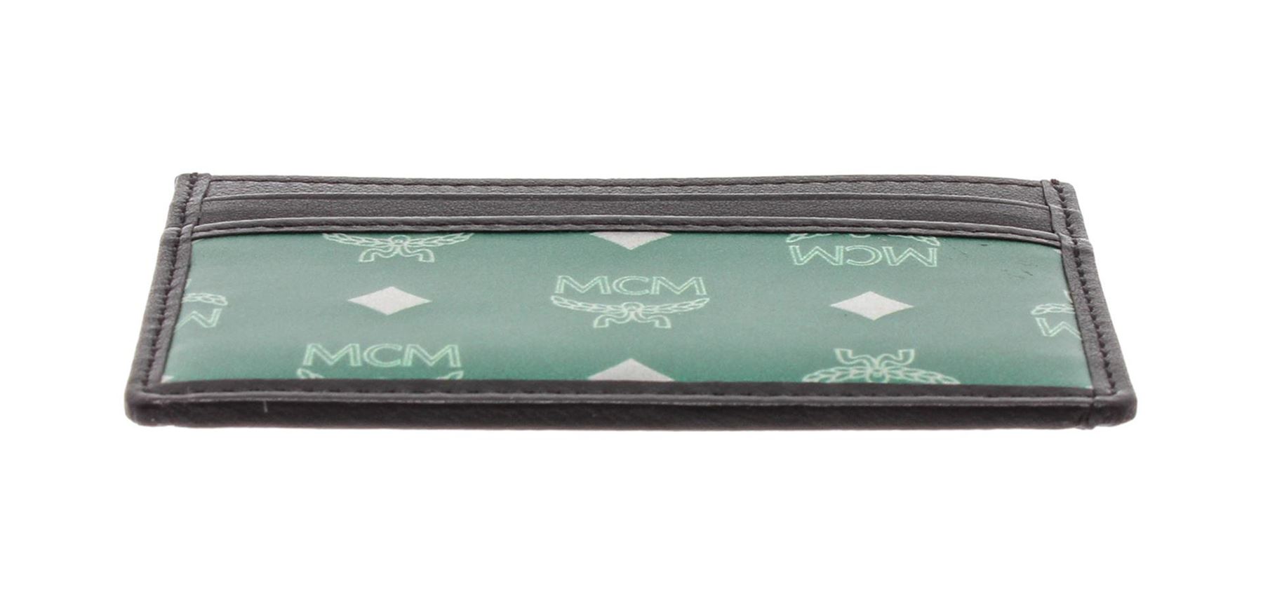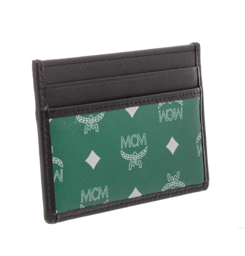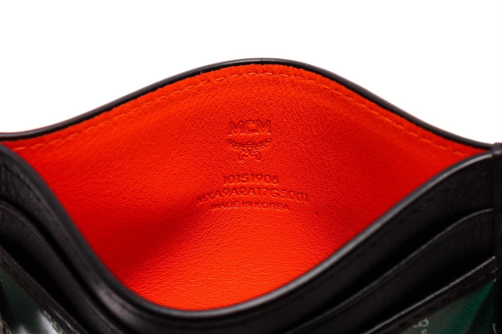 MCM Eden Green Reflective Nylon Mini Card Case with black leather trim, and orange leather interior.