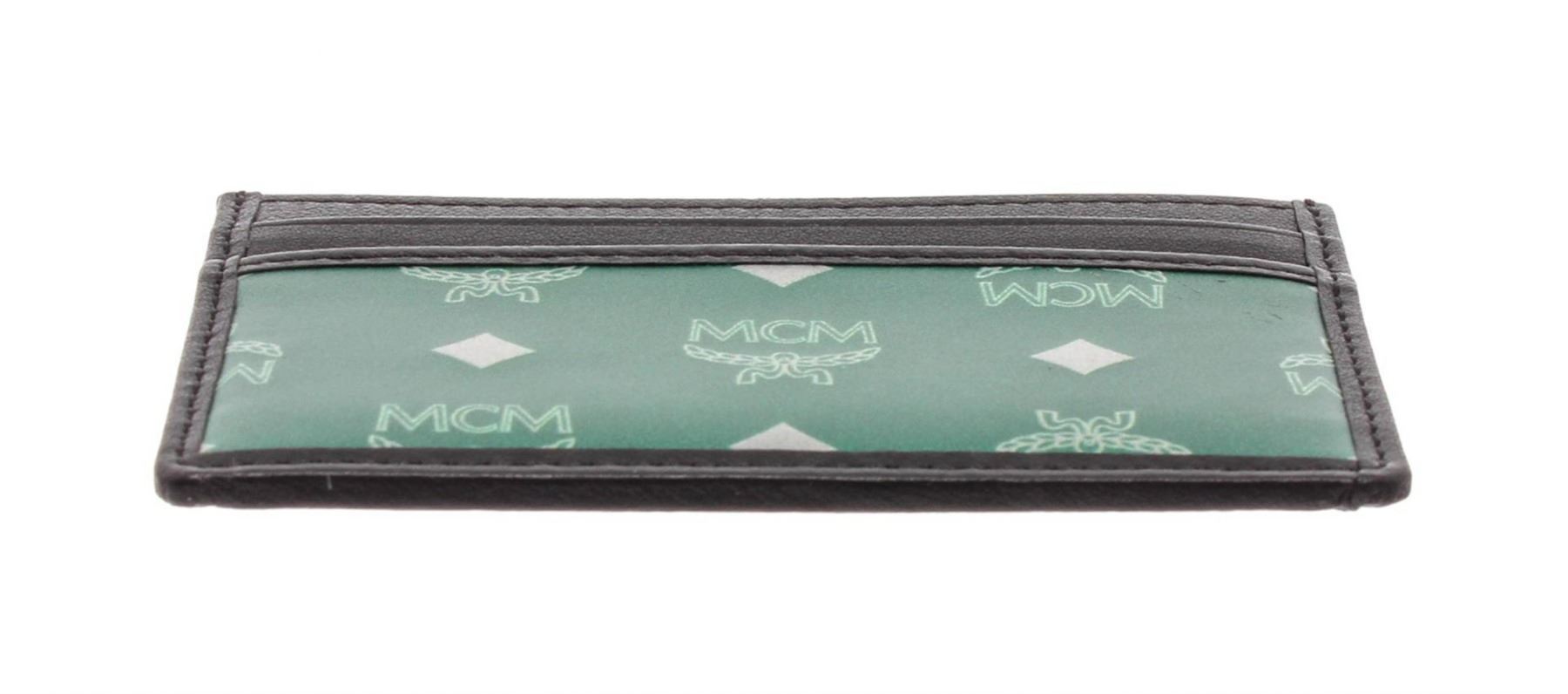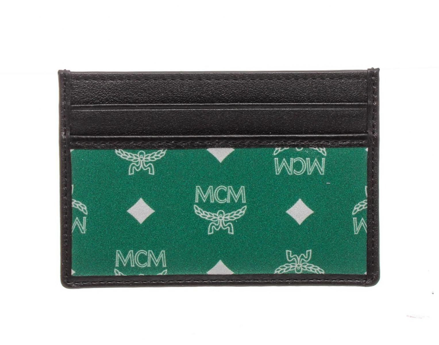 MCM Eden Green Reflective Nylon Mini Card Case with black leather trim, and orange leather interior.