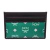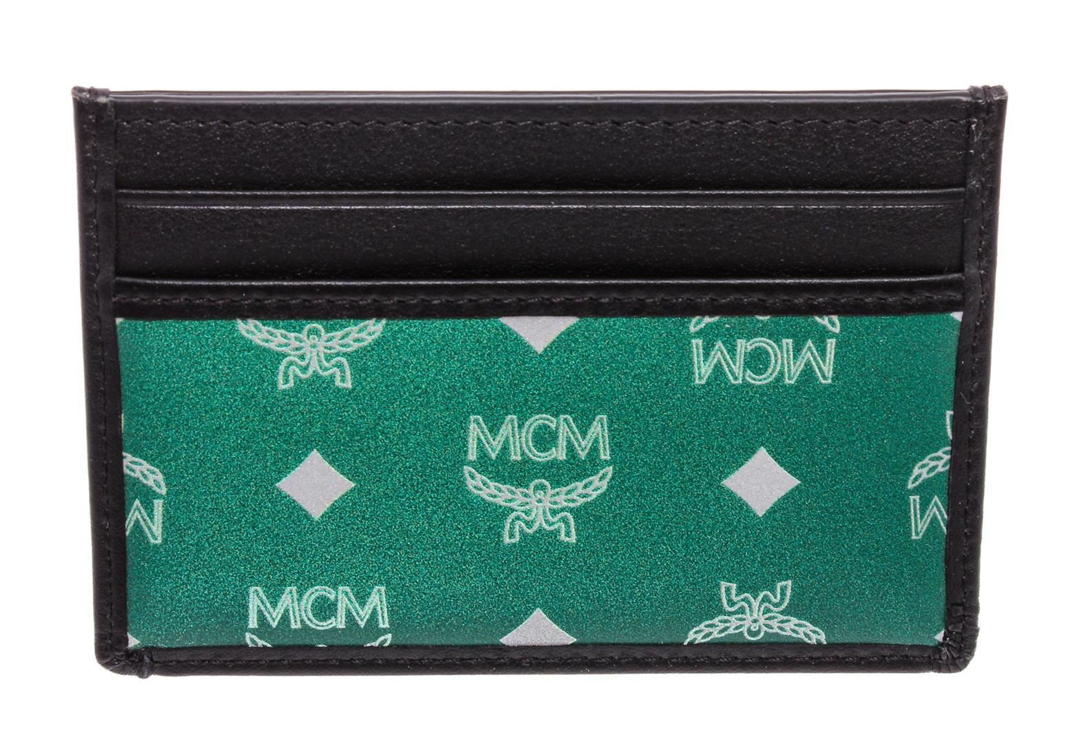 One MCM Eden Green Reflective Nylon Leather Mini Card Case. MCM Eden Green Reflective Nylon Mini Card Case with black leather trim, and orange leather interior.