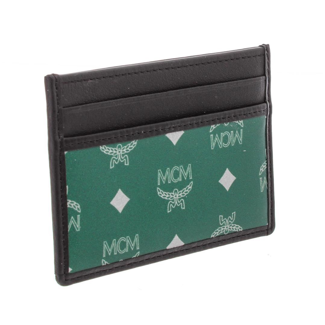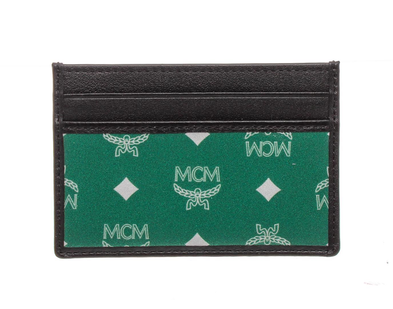 MCM Eden Green Reflective Nylon Mini Card Case with black leather trim, and orange leather interior.