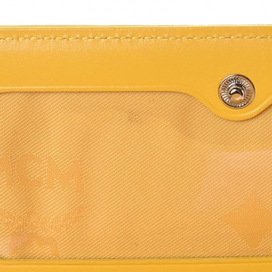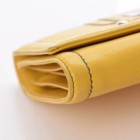 Detail: Crafted of calfskin leather in yellow with black stitching. The wallet features a frontal flap that opens to a leather interior with card slots, a billfold, an ID slot, and a small zipper compartment.