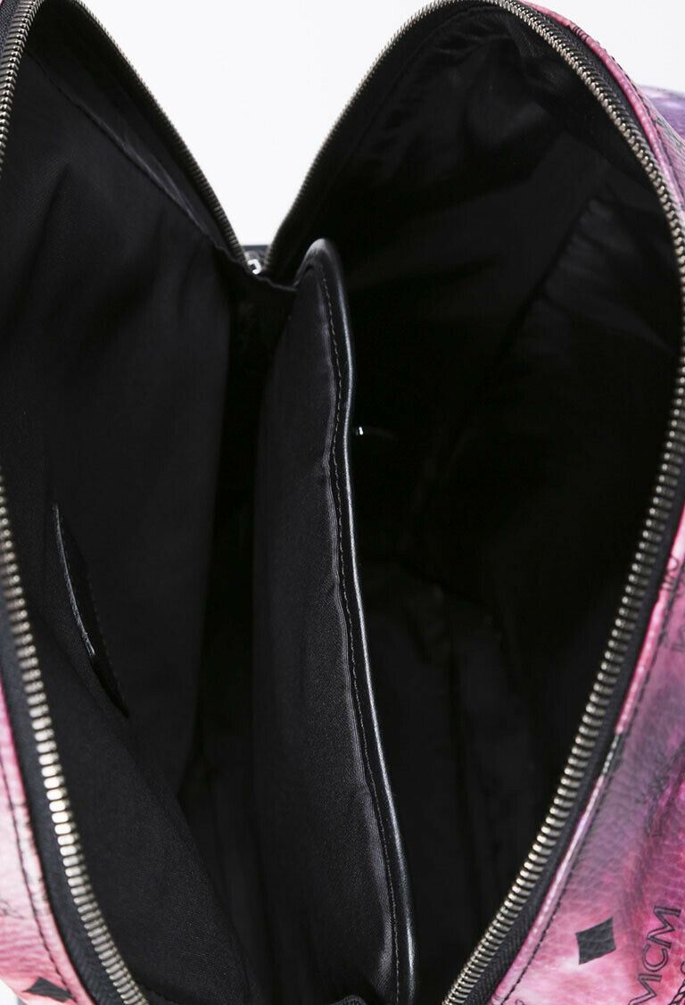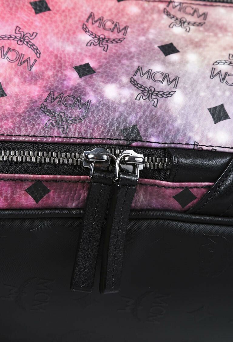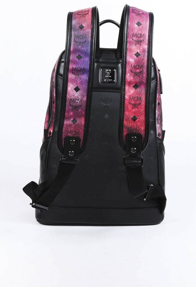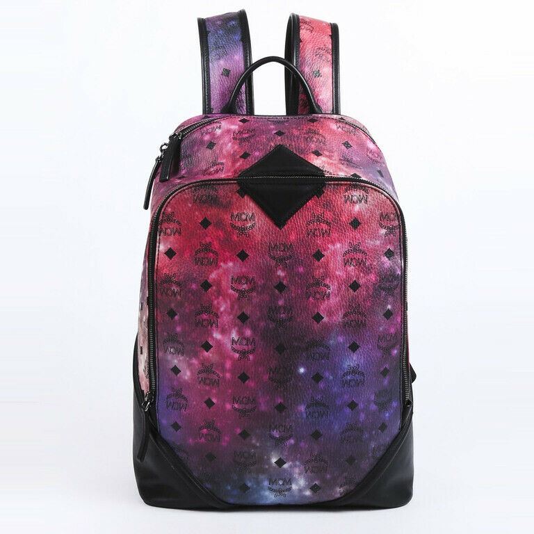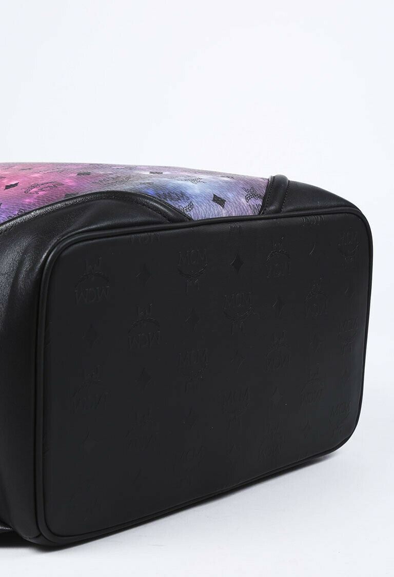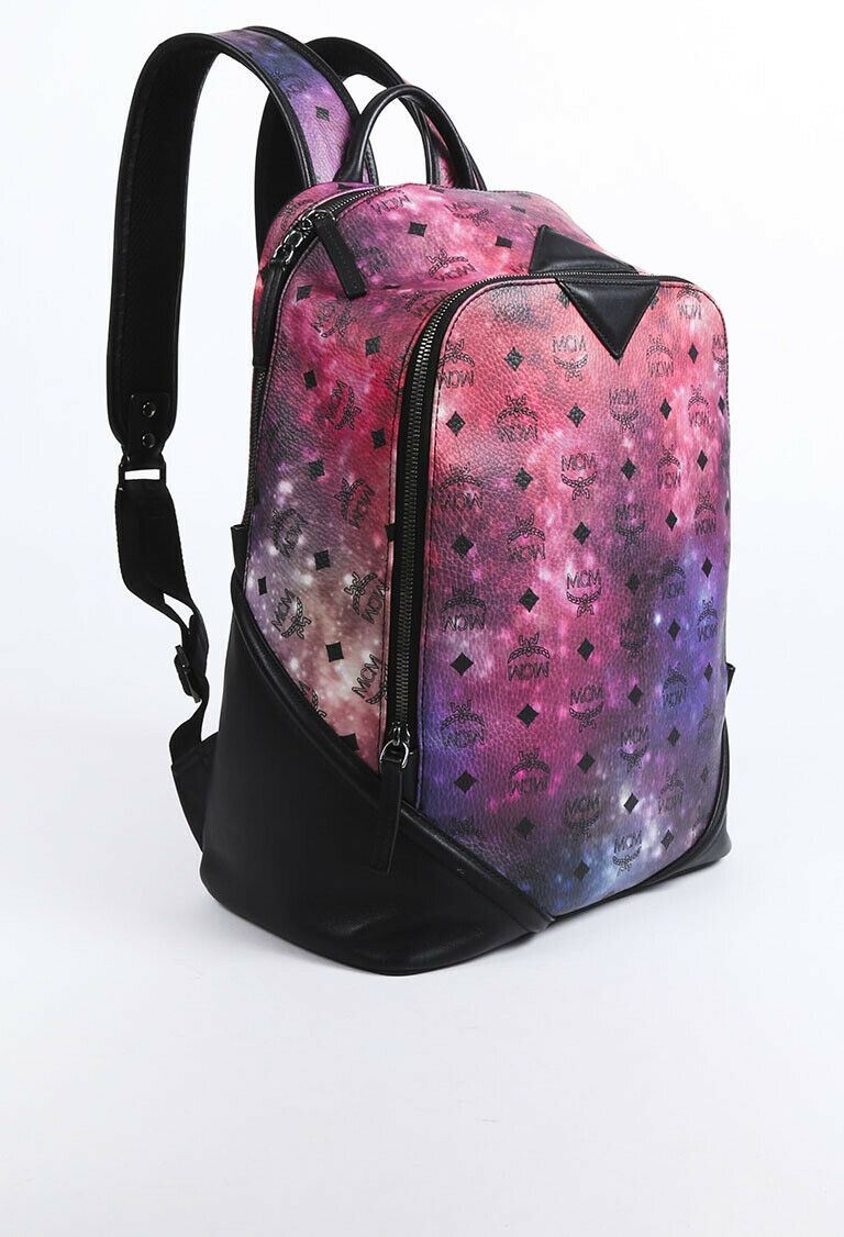 MCM Duke backpack is crafted from galaxy print monogram coated canvas and features gunmetal hardware, adjustable straps, front zip pocket, zip closure, and a lined interior with an 11" laptop pocket.