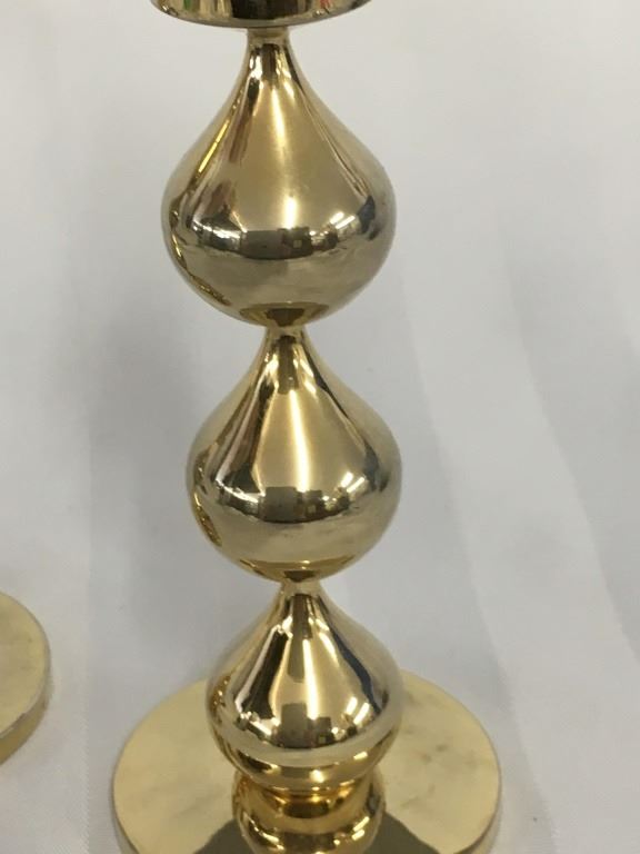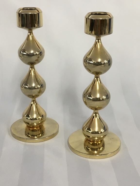 A pair of mid-century modern Made In Denmark candlesticks. They are plated in 24 Karat gold & designed by Hugo Asmussen. They are about 6 5/8" tall & in good condition with very minor wear but have been used & show some wax residue in the bowls.