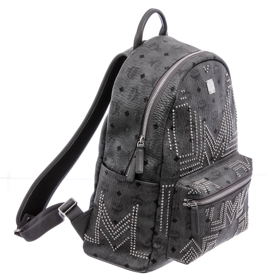 One MCM Gray Visetos Canvas Leather Medium Studded Backpack. Gray and Black Visetos canvas leather MCM Medium studded backpack with silver-tone hardware, black cloth interior lining, two interior slip pockets and two-way zipper closure at top.