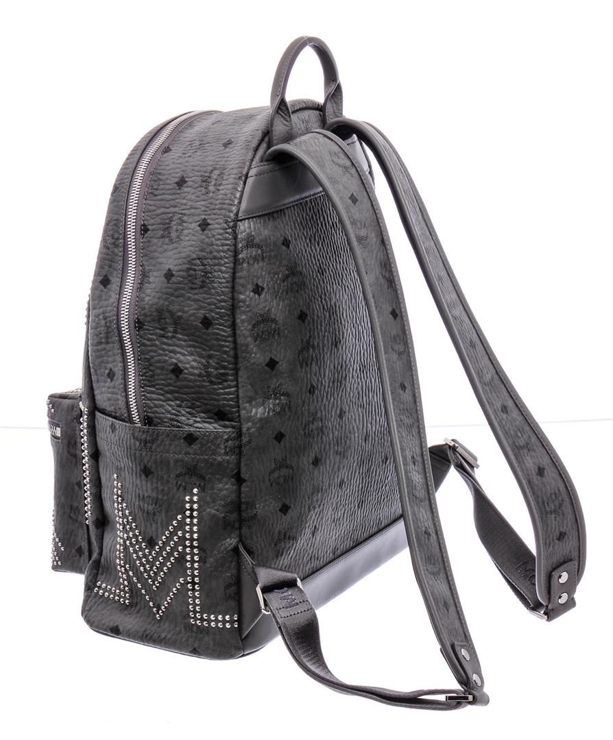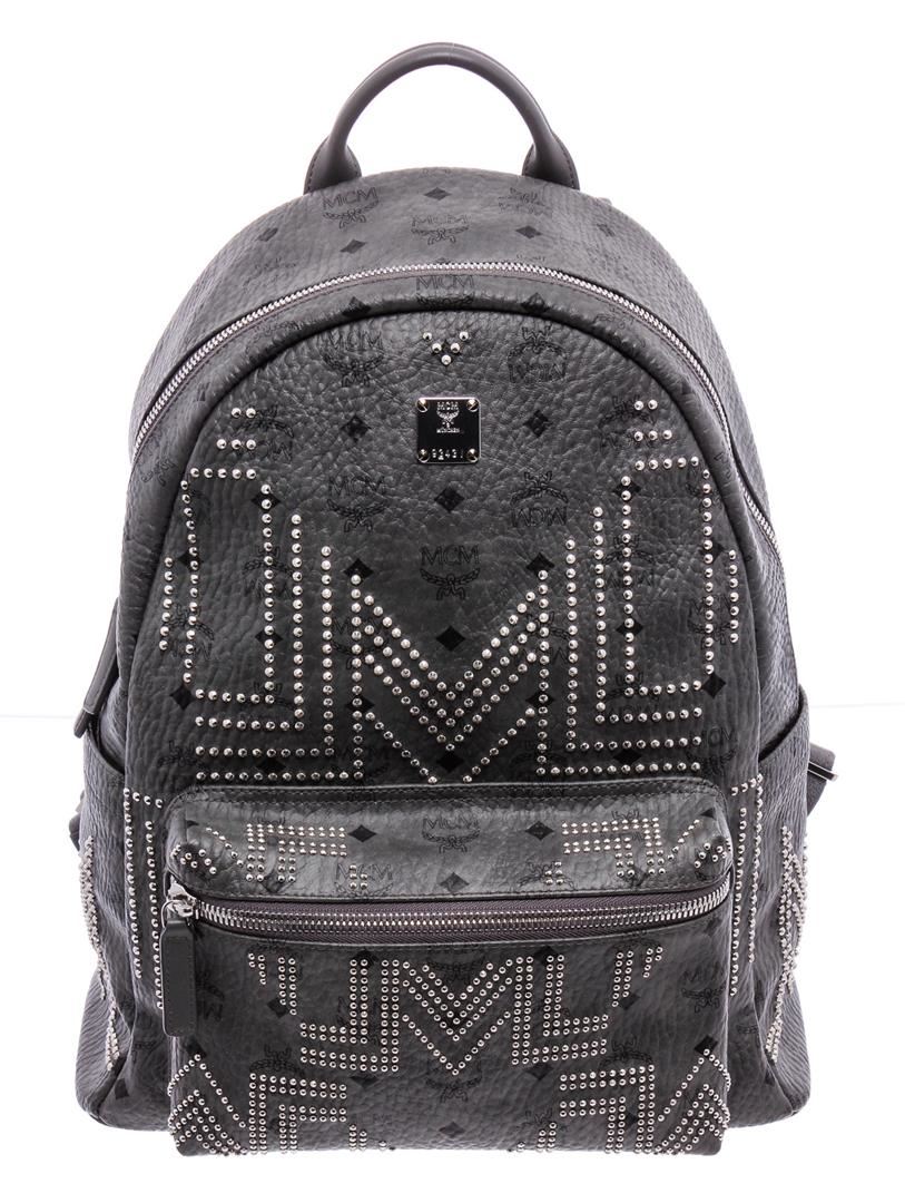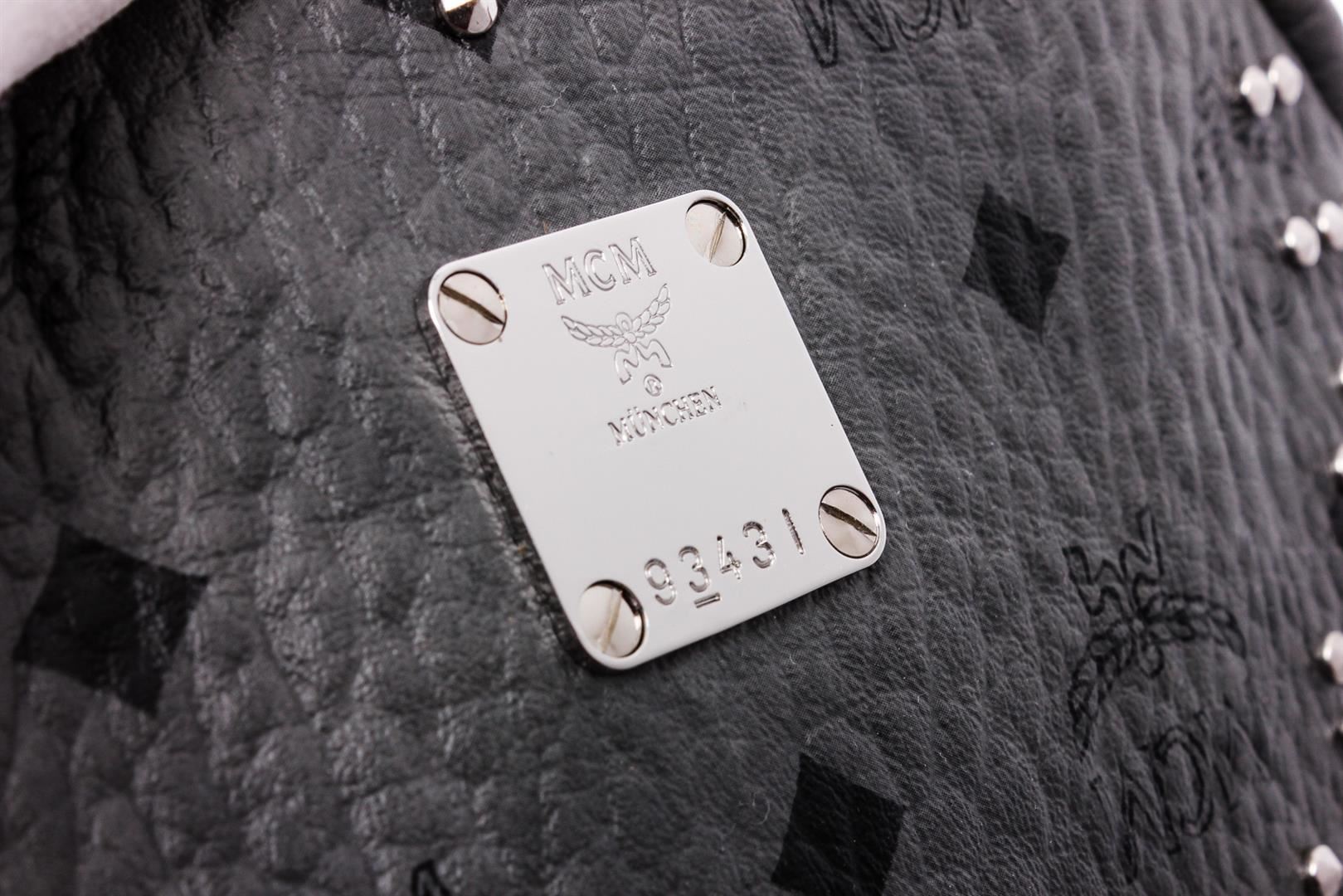 One MCM Gray Visetos Canvas Leather Medium Studded Backpack. Gray and Black Visetos canvas leather MCM Medium studded backpack with silver-tone hardware, black cloth interior lining, two interior slip pockets and two-way zipper closure at top.
