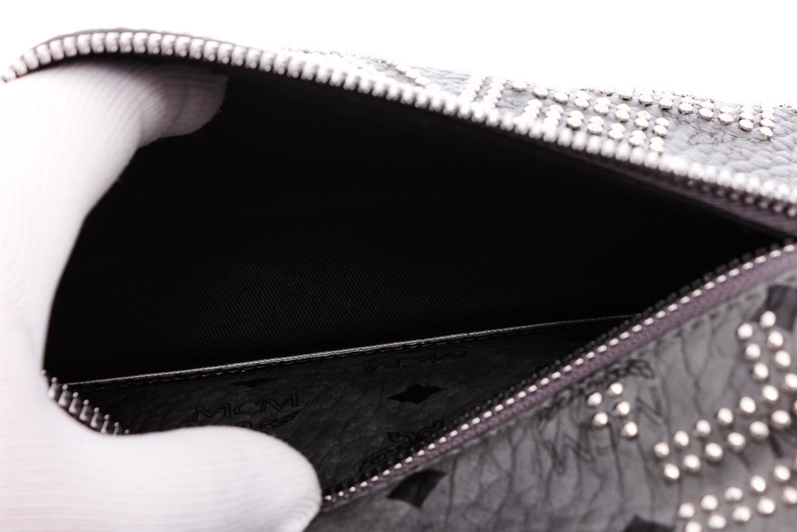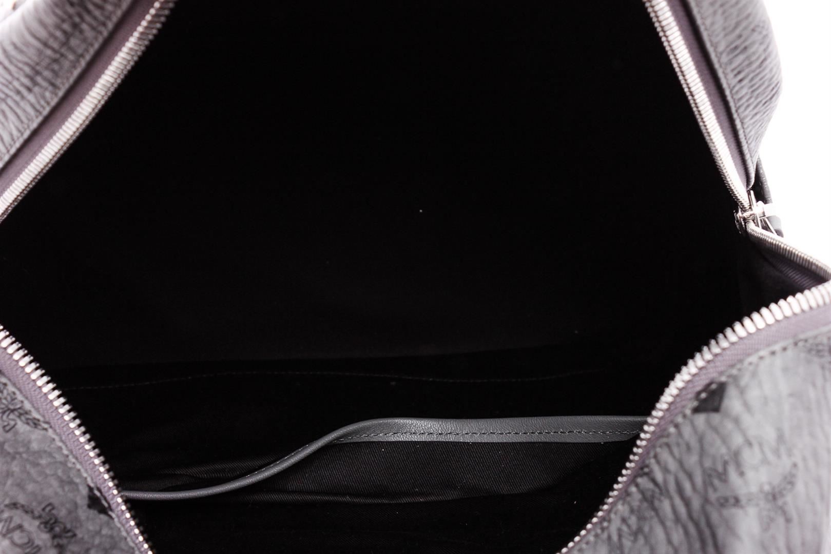 One MCM Gray Visetos Canvas Leather Medium Studded Backpack. Gray and Black Visetos canvas leather MCM Medium studded backpack with silver-tone hardware, black cloth interior lining, two interior slip pockets and two-way zipper closure at top.