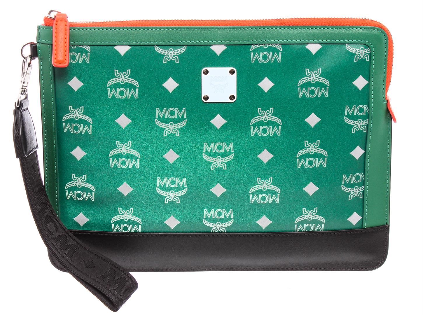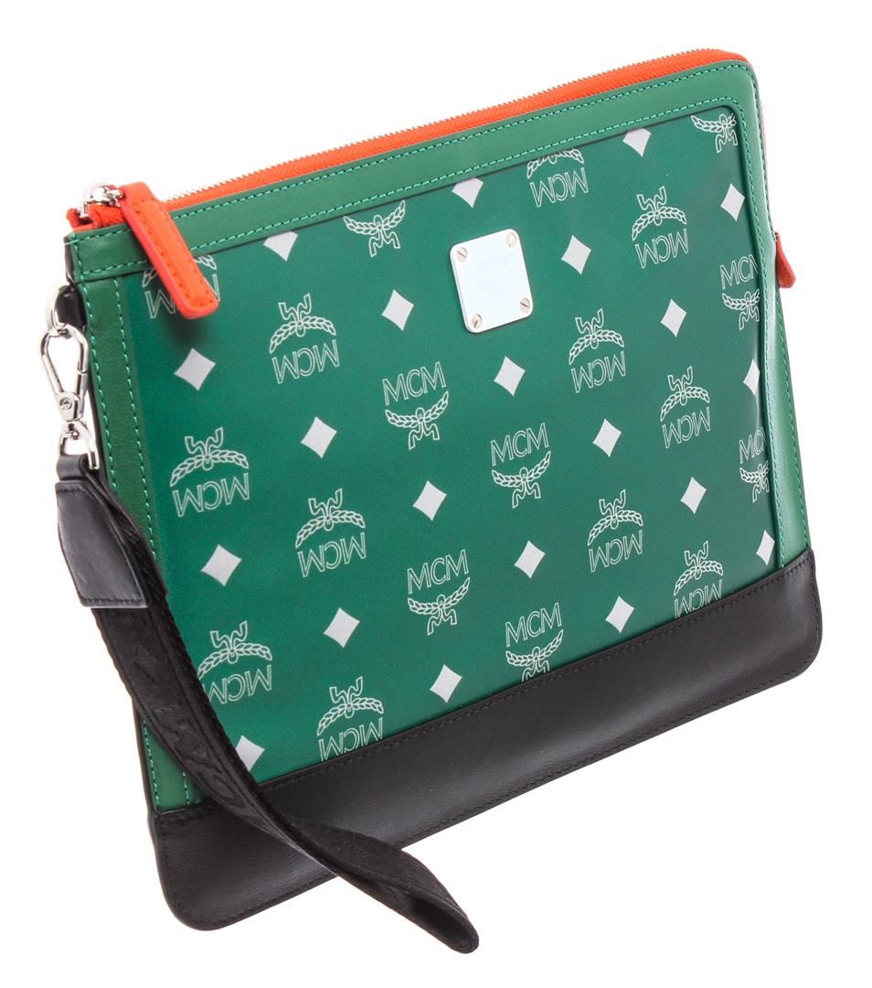 MCM Green Visetos Nylon Resnick Ipad Case with silver-tone hardware, black woven lining, interior card pocket, removable wristlet strap and overall zip closure.