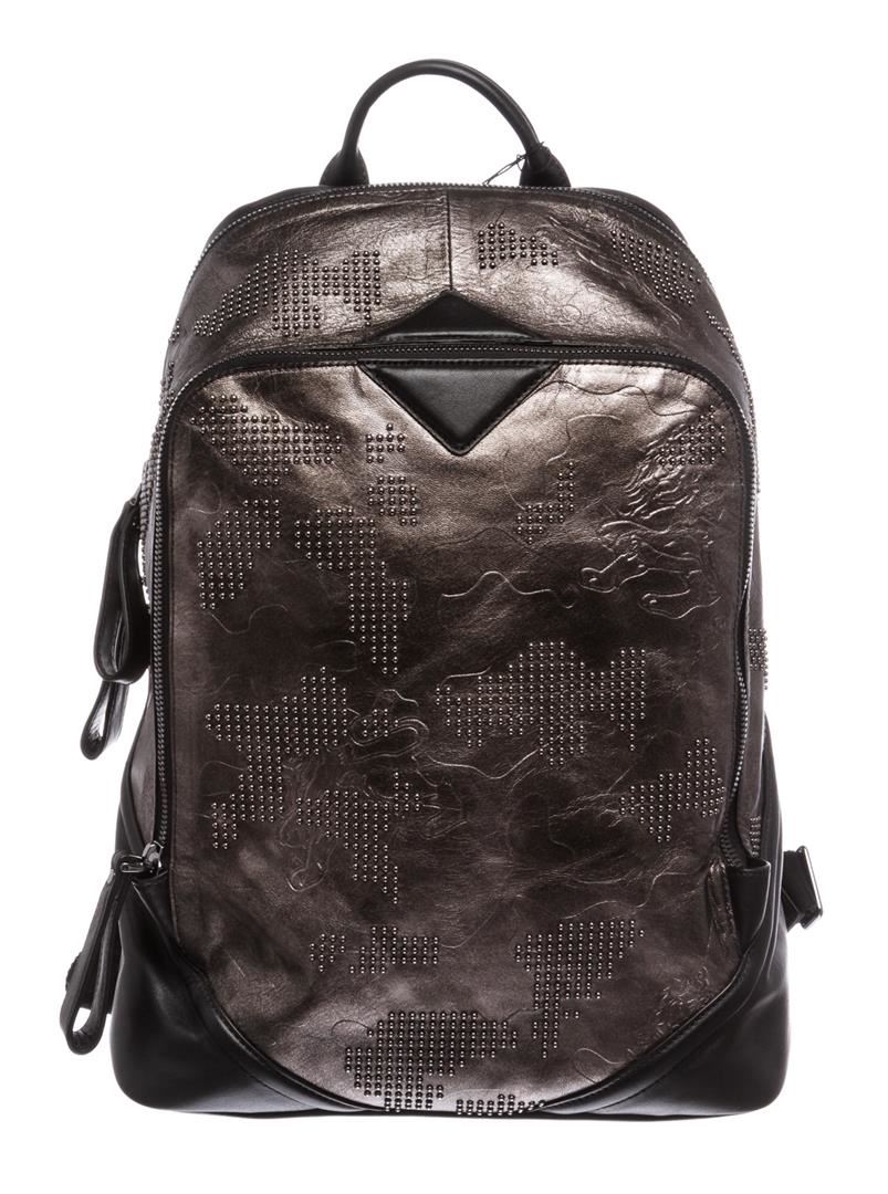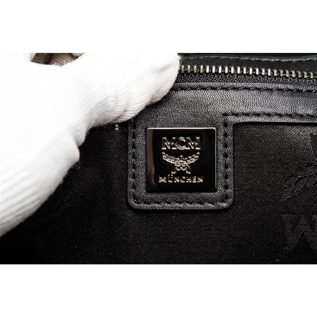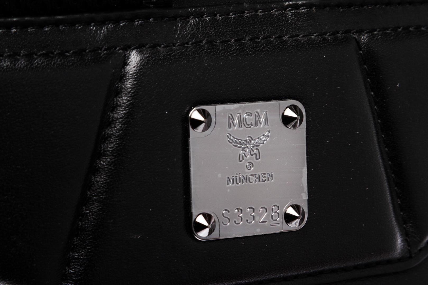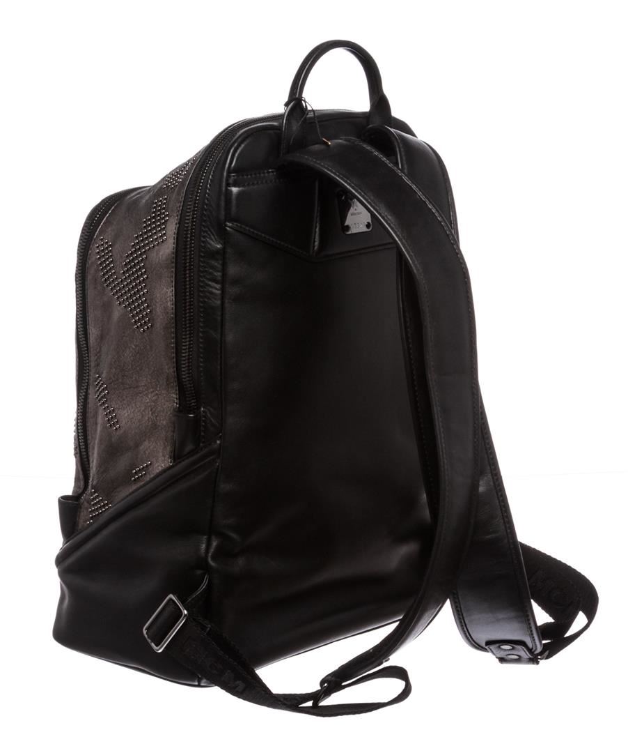 From the stencil lion series collection this gunmetal and black trim goat leather studded MCM backpack with gunmetal hardware, dual adjustable shoulder straps, single rolled handle at top, and zip pocket at front face, MCM black interior lining, expandable wall pocket with zip pocket, one side slip pocket and zip closure at top.