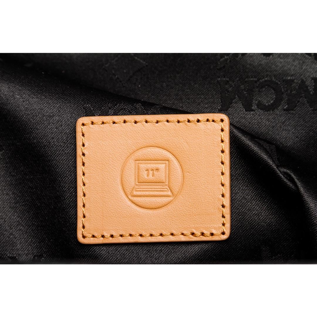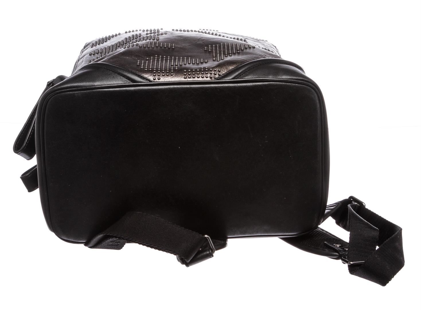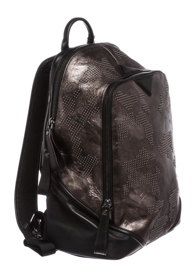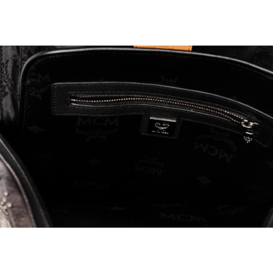 From the stencil lion series collection this gunmetal and black trim goat leather studded MCM backpack with gunmetal hardware, dual adjustable shoulder straps, single rolled handle at top, and zip pocket at front face, MCM black interior lining, expandable wall pocket with zip pocket, one side slip pocket and zip closure at top.