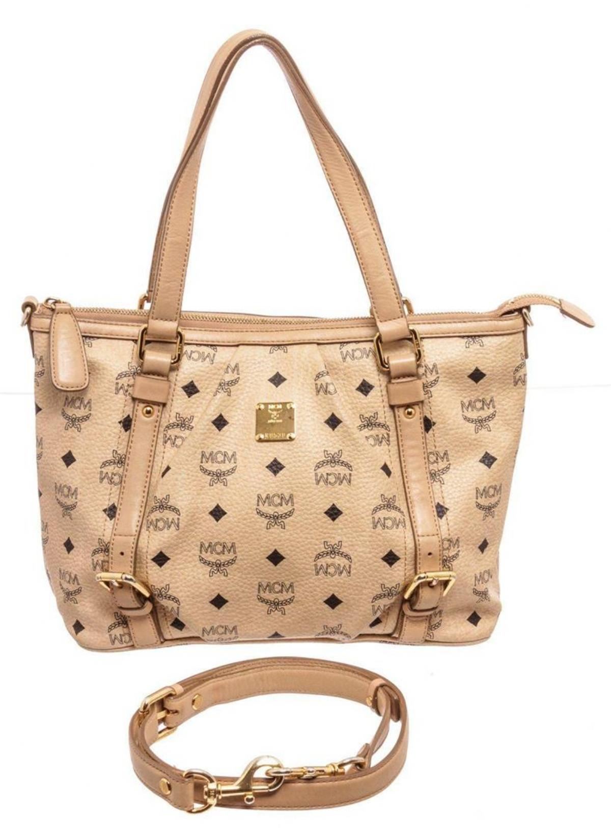 MCM Ivory Visetos Coated Canvas 2 Way Shoulder Bag with gold-tone hardware, Dual flat top handles, single flat detachable shoulder strap, brown canvas interior lining, three interior pockets, and zipper closure. C Measurements: Length: 17.5 in / 44 cm Width: 5.5 in / 14 cm 16 in / 41 cmCONDITION: Pre-Owned Good overall, please see photographs for detail.