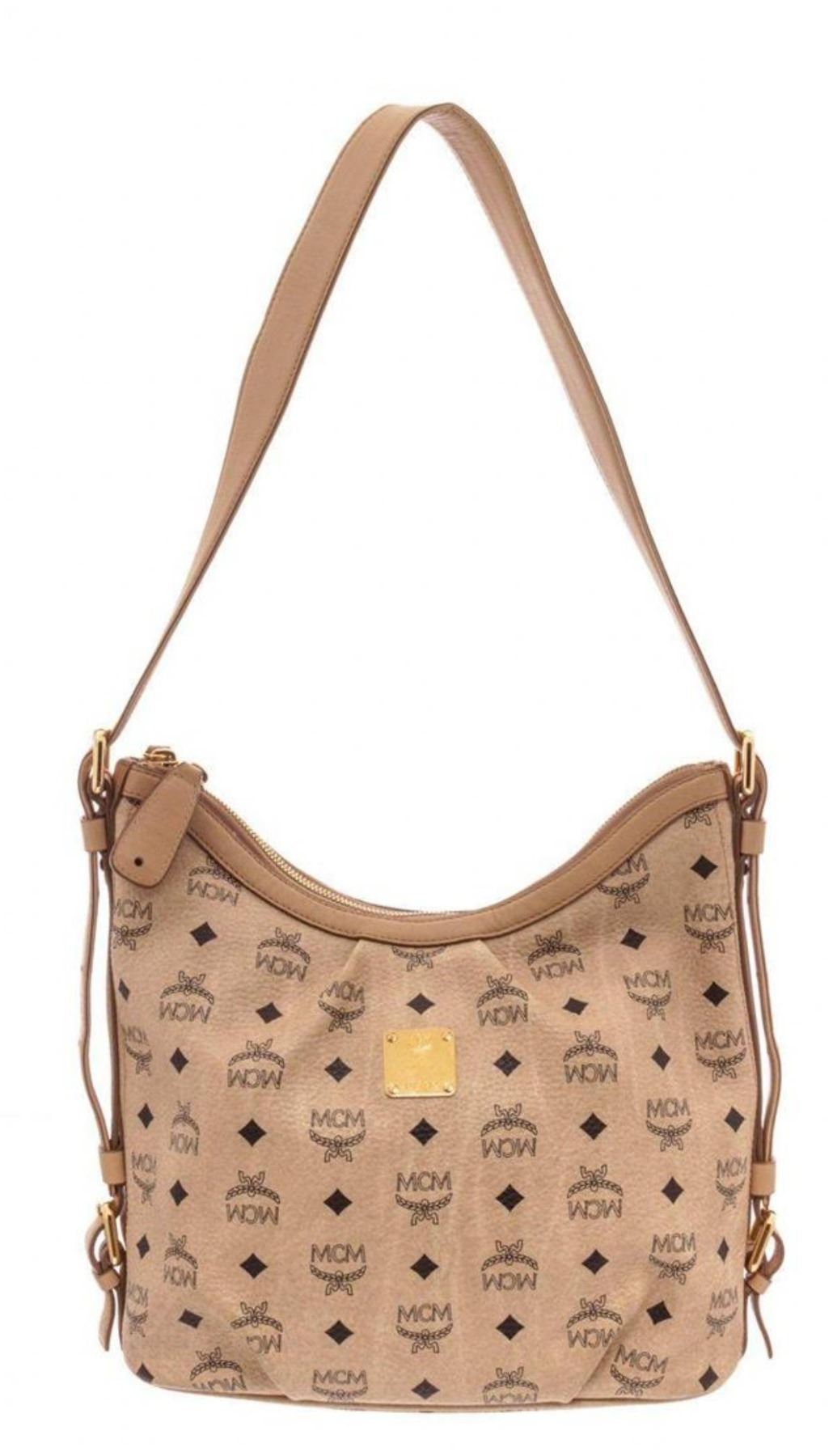 MCM Ivory Visetos Coated Canvas Hobo Bag. Ivory Visetos coated canvas hobo bag with gold-tone hardware, single flat shoulder strap, logo placard at front face, brown canvas interior lining, three interior pockets and overall zipper closure at top. Mea