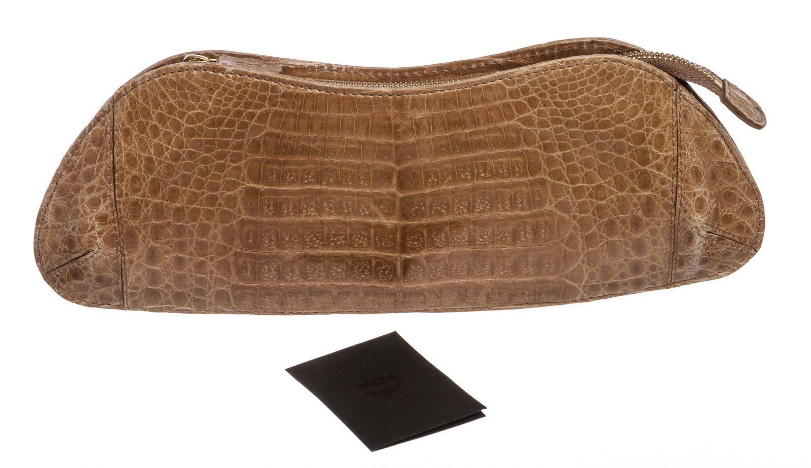 MCM Light Brown Crocodile Leather Evening Clutch. All available information is listed in the description and shown in the photos. Light brown crocodile leather MCM Evening clutch with gold-tone hardware, leather interior lining, zipper pocket at interior wall and an overall zipper closure. 13"x1.75"x5"