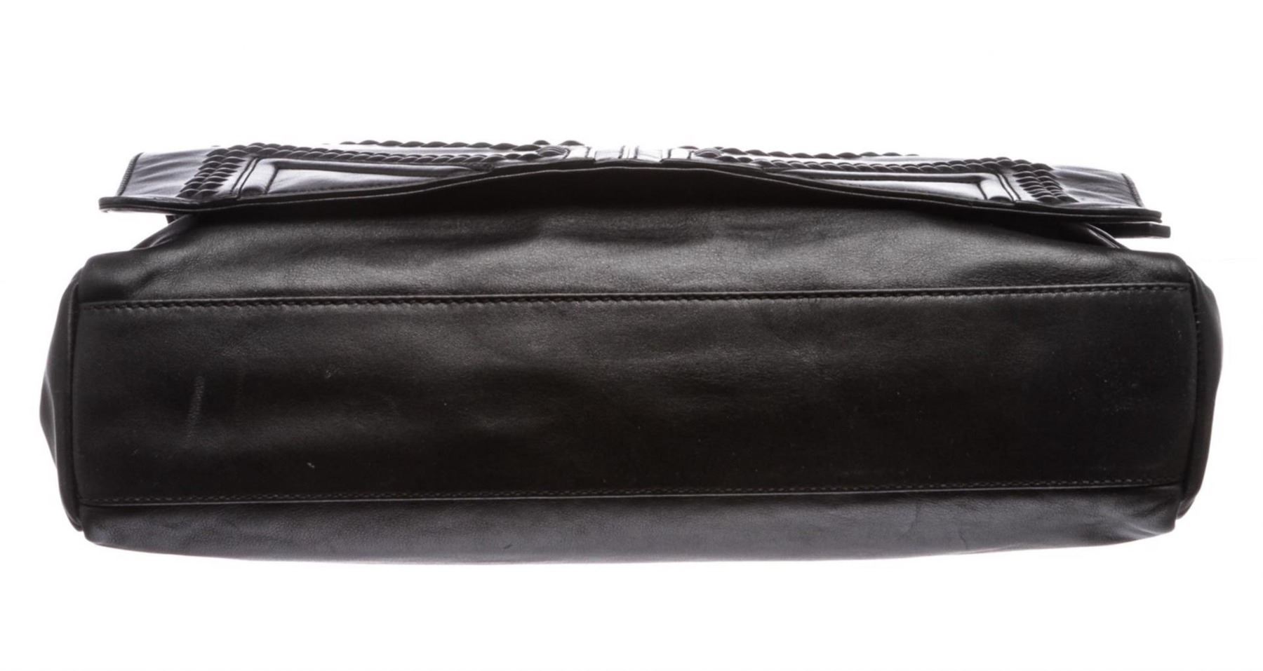 One MCM M. Moment Black Leather Messenger Bag. Black leather MCM M. Moment messenger bag contains tonal stitching, debossed stud details at front face and detachable shoulder strap. Interior is satin lined and contains two compartments, one zipper two zipper pockets, and two side slip pockets. Exterior contains a zip pocket under the dual magnetic flap closure at front.