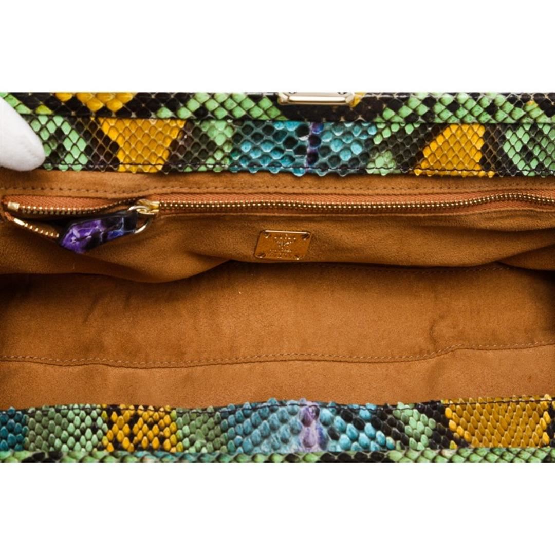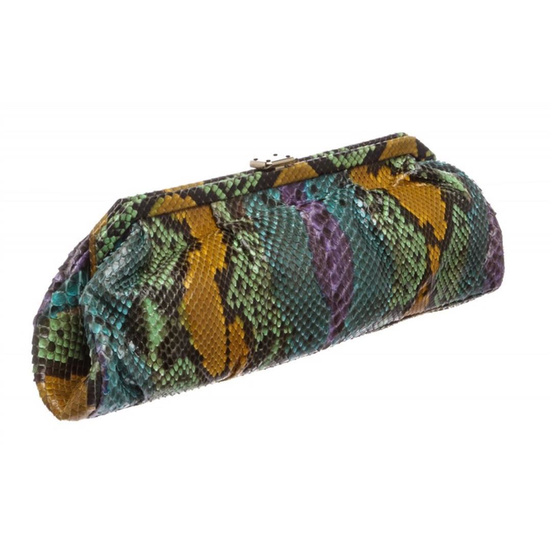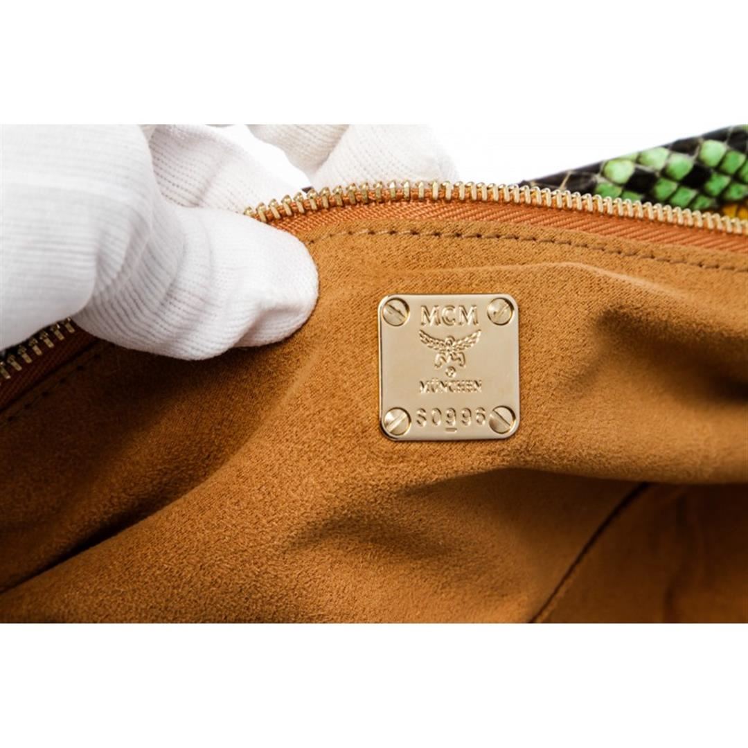 MCM multicolor snakeskin leather long clutch with gold tone snap closure. Inner brown fabric lined and one side zip pocket. Item is Pre-Owned.