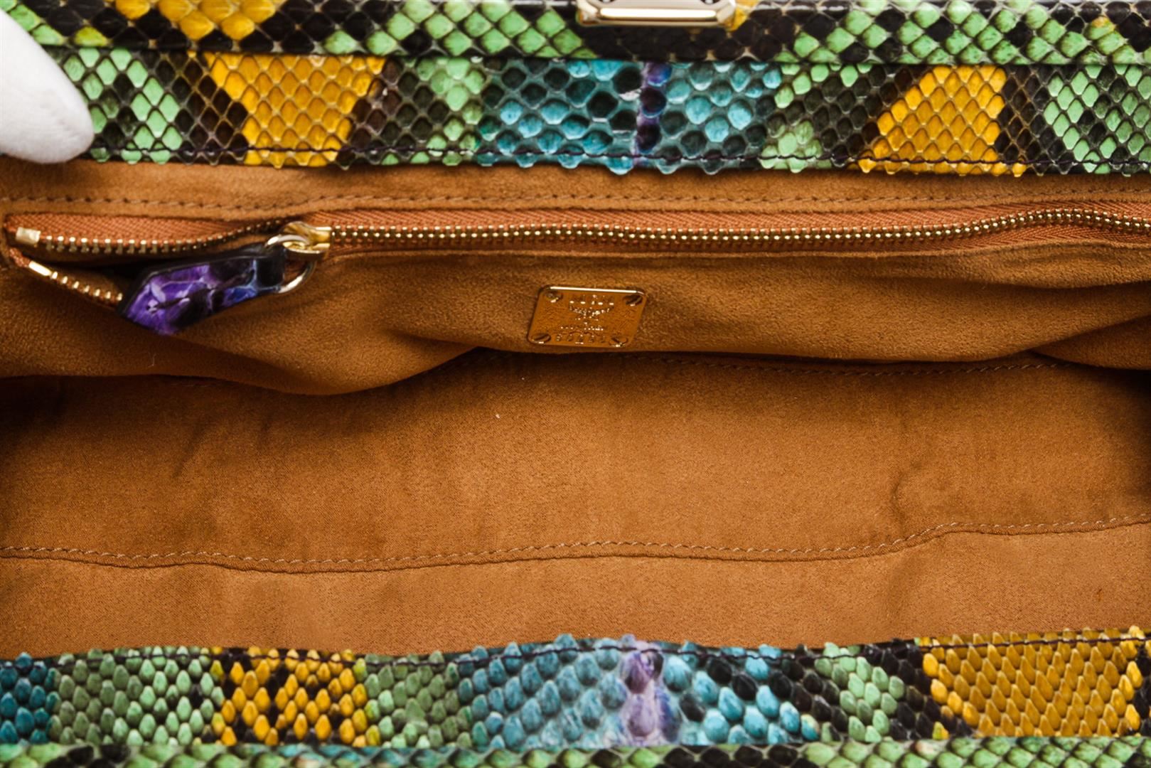 MCM multicolor snakeskin leather long clutch with gold tone snap closure. Inner brown fabric lined and one side zip pocket.