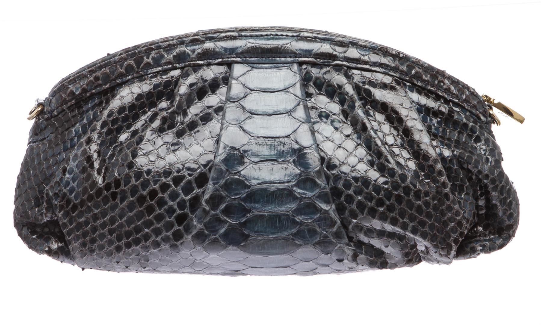 Overall zipper closure. Interior is satin lined with one slip pocket and one zipper pocket.
