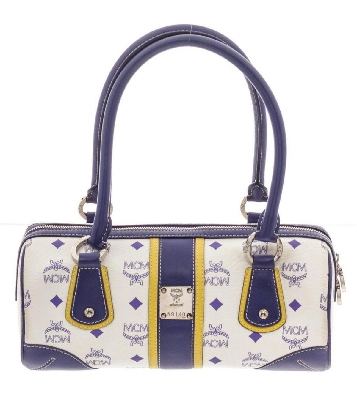 MCM Navy & White Visetos Coated Canvas and Leather Tote Bag with silver-tone hardware, dual rolled top handles, logo placard at front face, blue canvas interior lining, three interior pockets, one with zip closure, and overall zip closure at top. Measurements: Length: 4.75 in / 12 cm Width: 10.5 in / 27 cm 8 in / 20 cmCONDITION: Pre-Owned Good overall, please see photographs for detail.