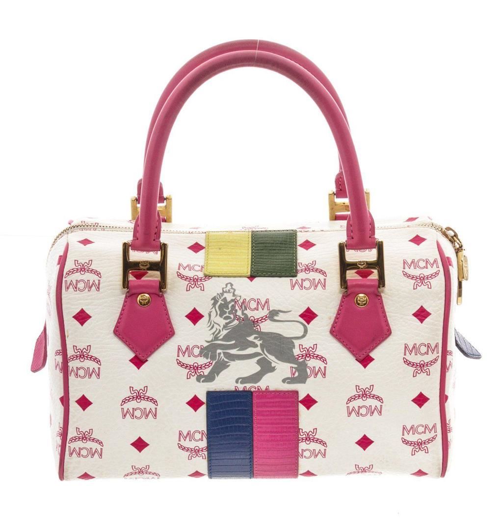 MCM Pink & White Visetos Coated Canvas & Leather Lion Boston Bag with silver-tone hardware, dual rolled top handles, croc embossed leather stripes and lion design at front, brown suede interior lining, three interior pockets and overall zip closure at top.      Measurements:  Length: 4.75 in / 12 cm  Width: 10.5 in / 27 cm  8 in / 20 cmCONDITION: Pre-Owned Good overall, please see photographs for detail.