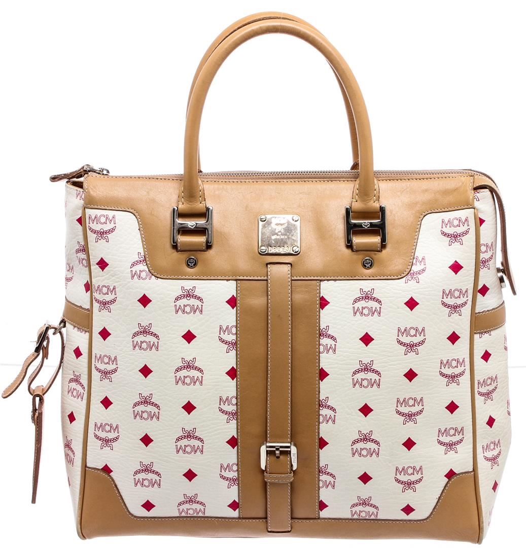 MCM pink & white Visetos coated canvas & leather tote bag with tan leather trim, silver-tone hardware, logo placard at front, dual rolled top handles, tan suede interior lining, three interior pockets; one with zip closure and overall zip closure at top.