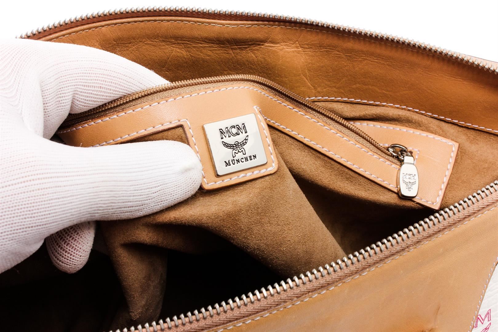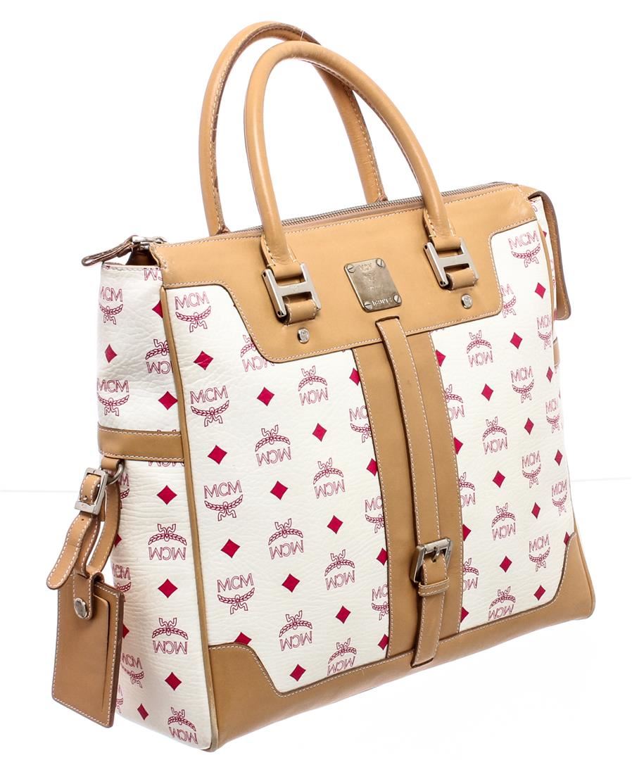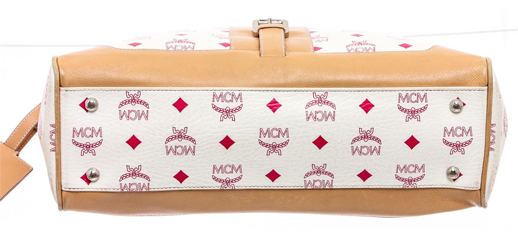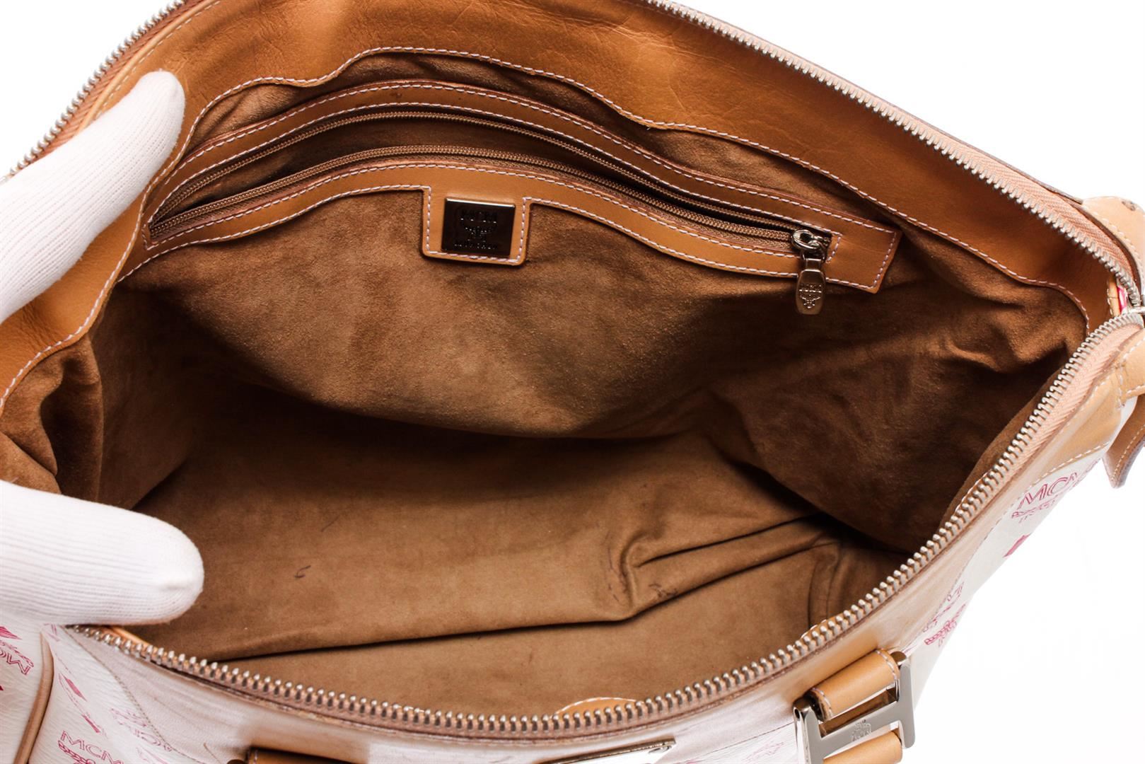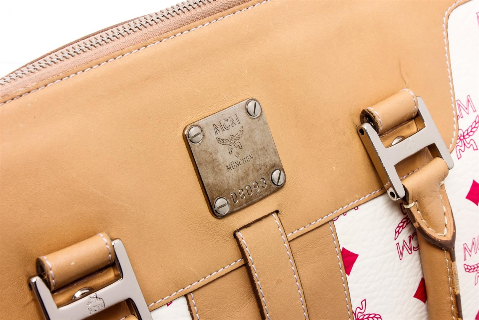 MCM pink & white Visetos coated canvas & leather tote bag with tan leather trim, silver-tone hardware, logo placard at front, dual rolled top handles, tan suede interior lining, three interior pockets; one with zip closure and overall zip closure at top.