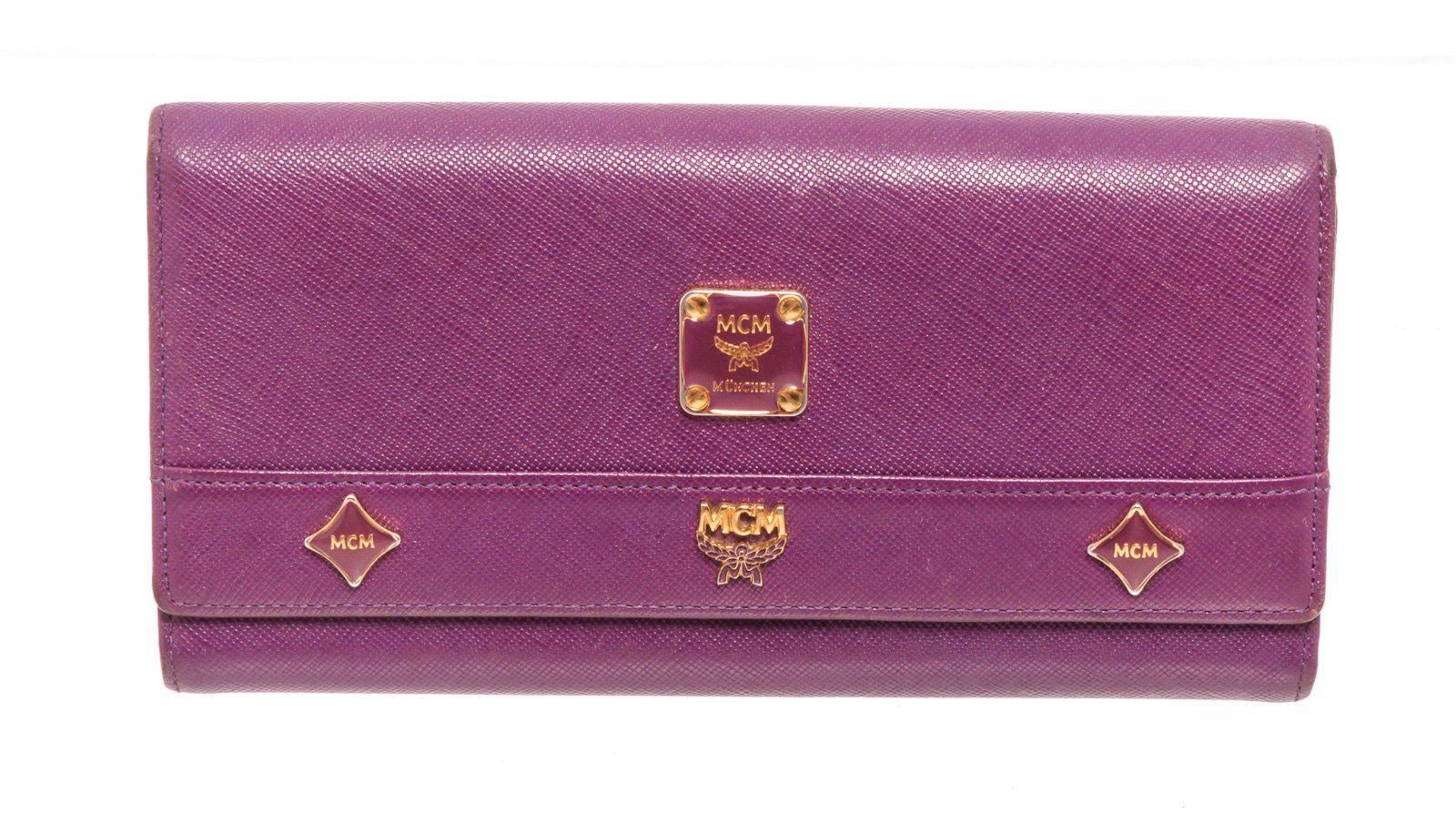 MCM Purple Leather Long Flap Wallet with gold-tone hardware, logo placard and stud embellishments at front face, four interior compartments, four card holder slots and overall snap closure at front. Measurements: Length: 1 in / 3 cm Width: 7.75 in / 20 cm 4 in / 10 cmCONDITION: Pre-Owned Good overall, please see photographs for detail.