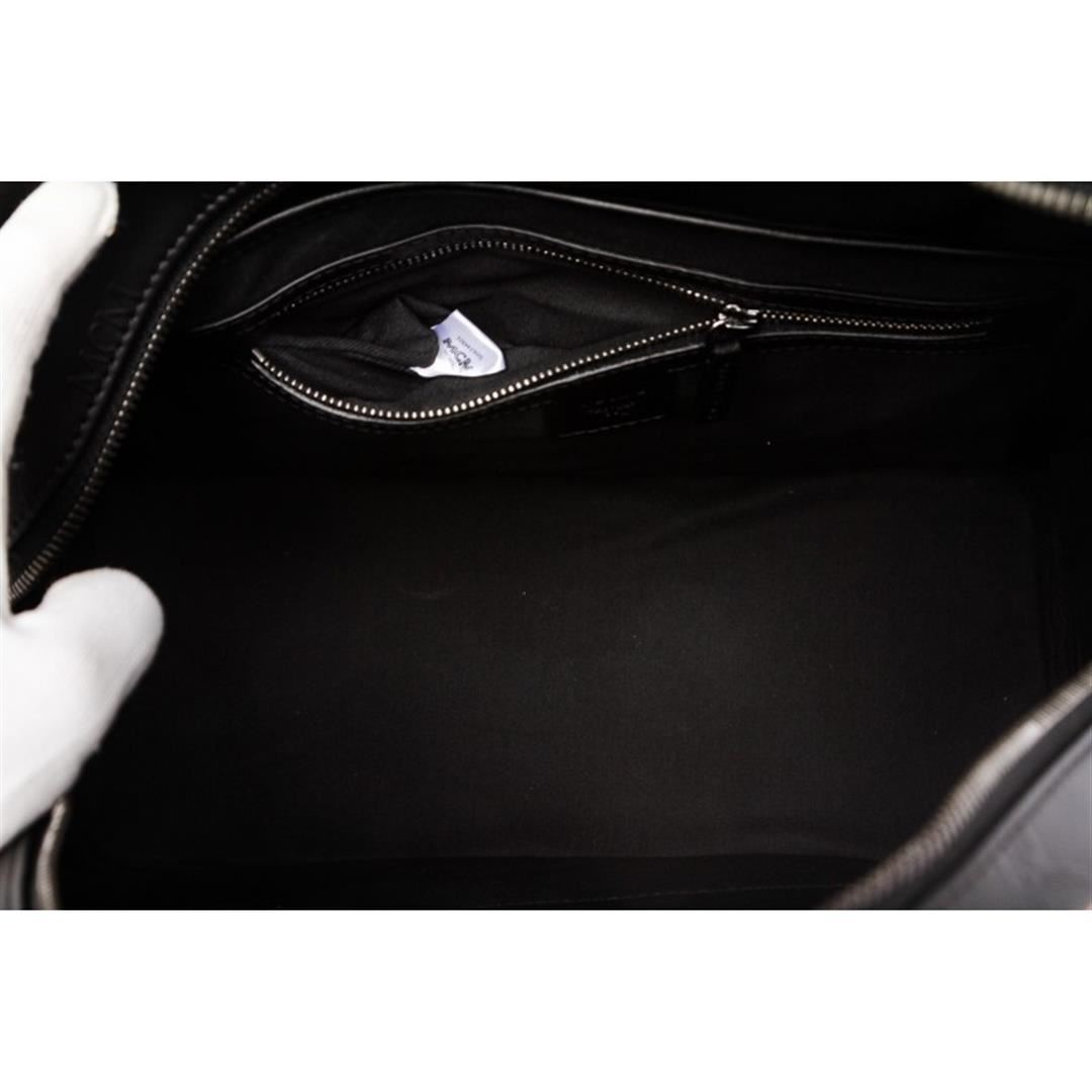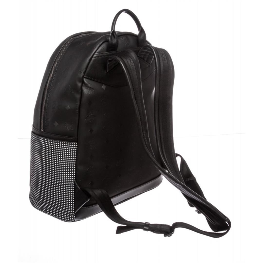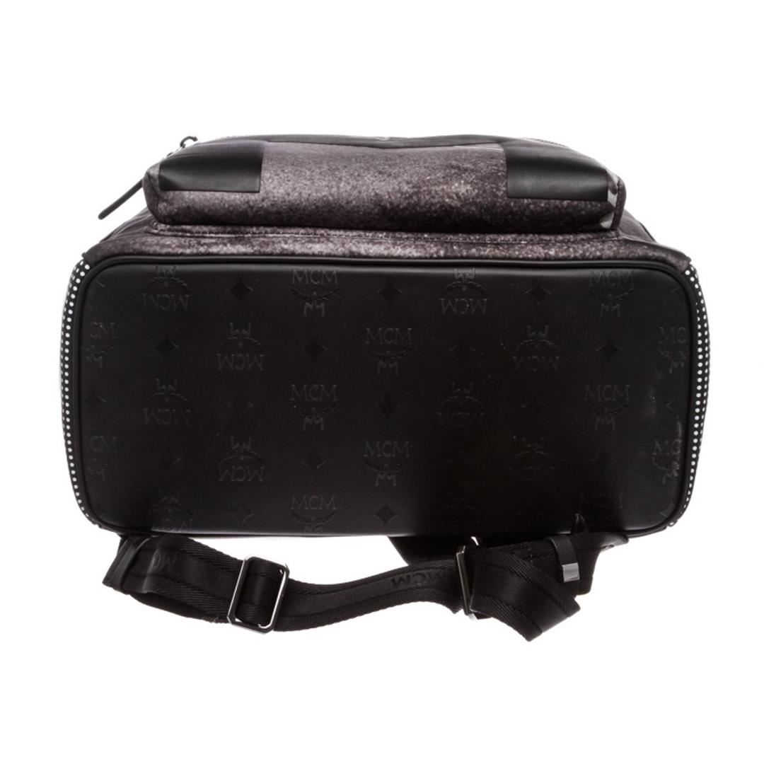Black and Red Visetos Coated Canvas MCM backpack with gunmetal tone hardware, dual adjustable flat shoulder straps, single flat handle, one exterior zipper compartment and two side slip pockets. Interior is fabric lined with one expandable slip pocket, one side slip pocket and one zipper pocket. Item is Pre-Owned.