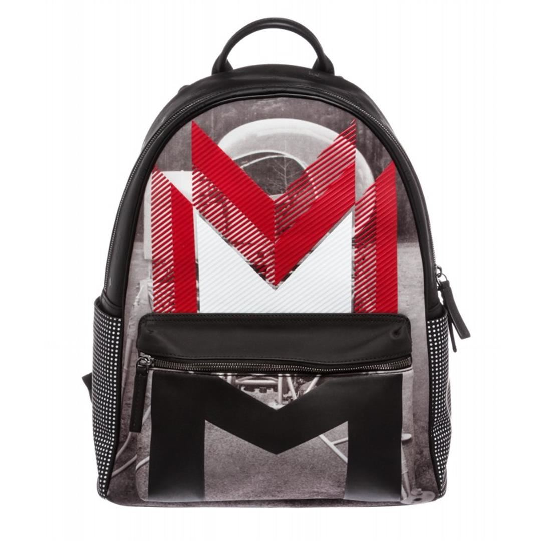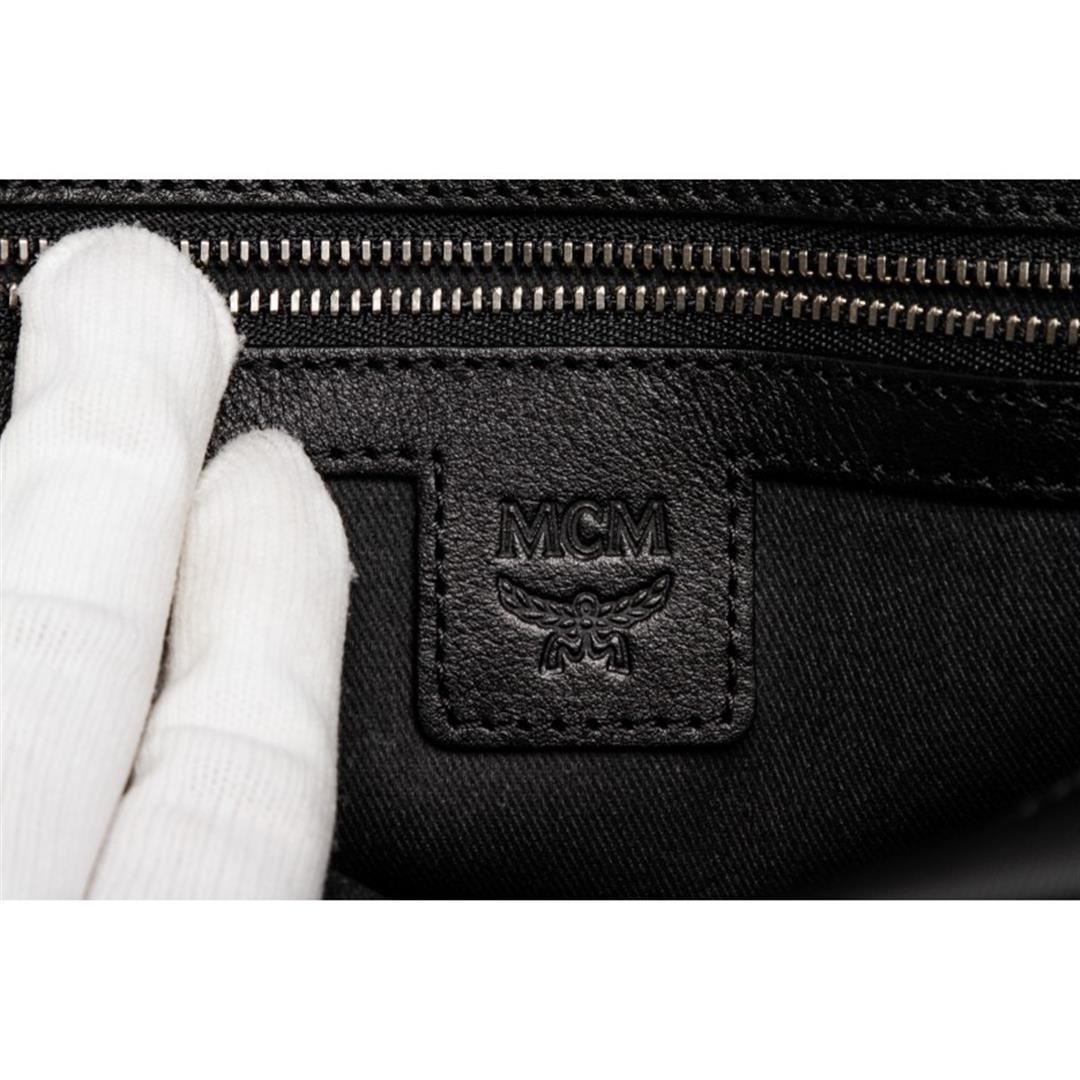 Black and Red Visetos Coated Canvas MCM backpack with gunmetal tone hardware, dual adjustable flat shoulder straps, single flat handle, one exterior zipper compartment and two side slip pockets. Interior is fabric lined with one expandable slip pocket, one side slip pocket and one zipper pocket. Item is pre-owned.