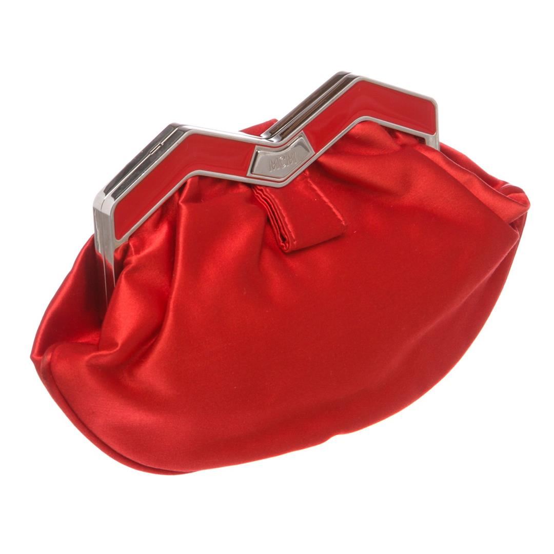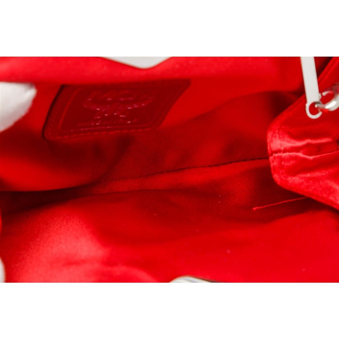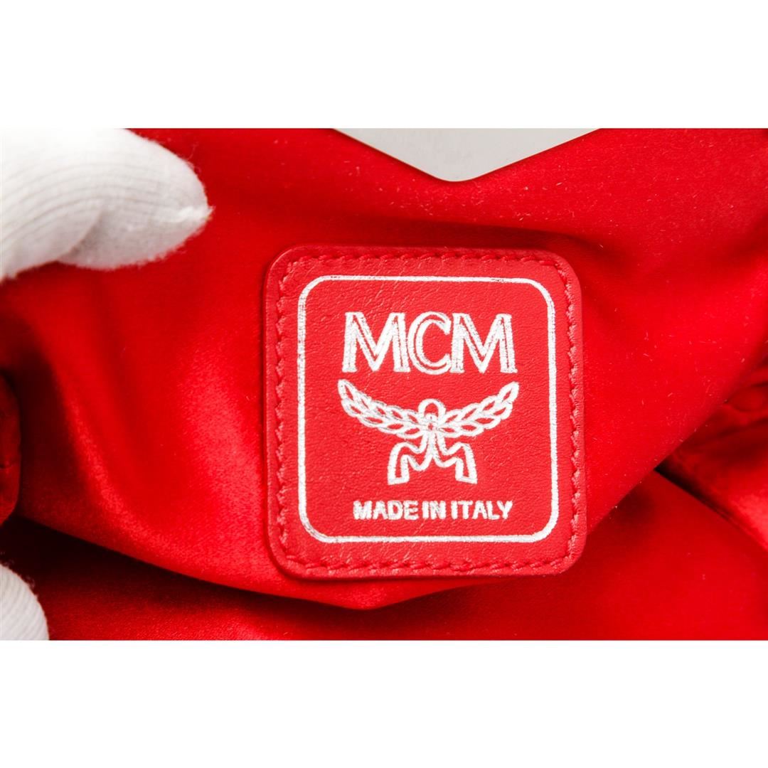Overall magnetic closure. Interior is satin lined with MCM logo patch. Includes removable chain shoulder strap.