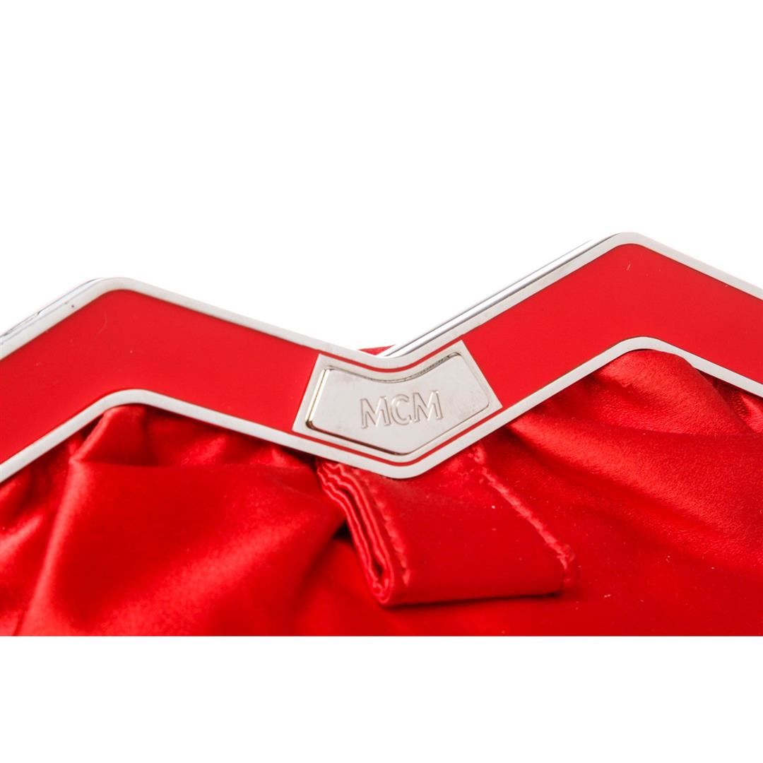 Overall magnetic closure. Interior is satin lined with MCM logo patch. Includes removable chain shoulder strap.