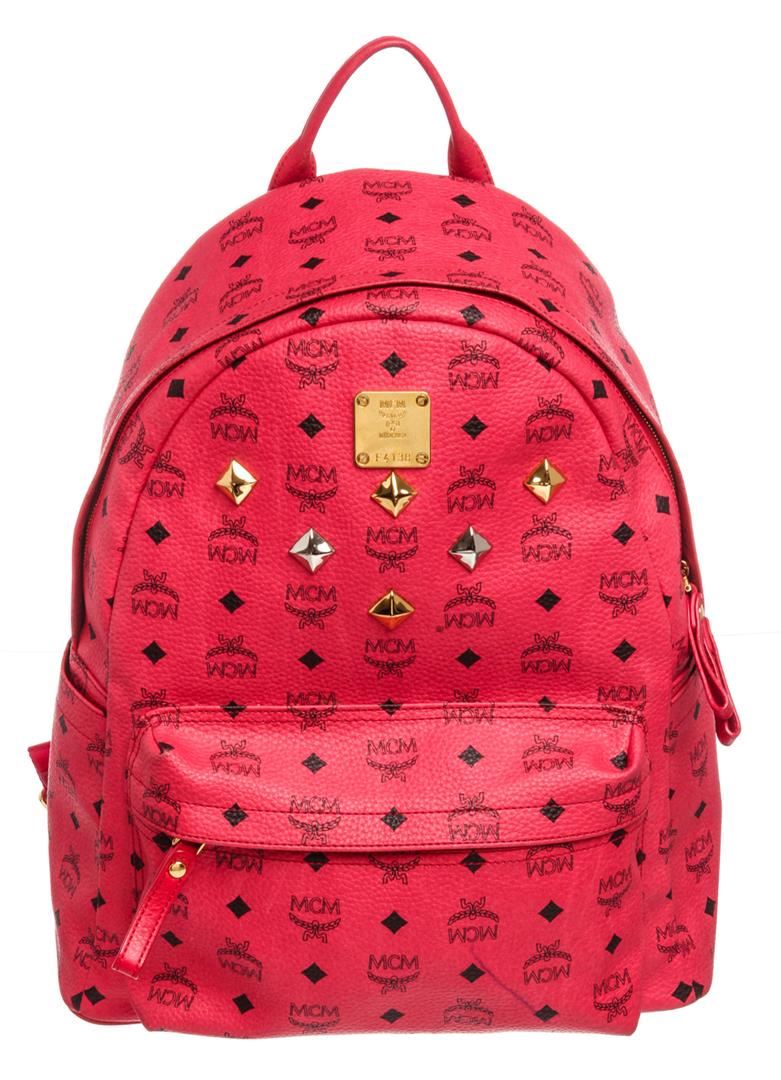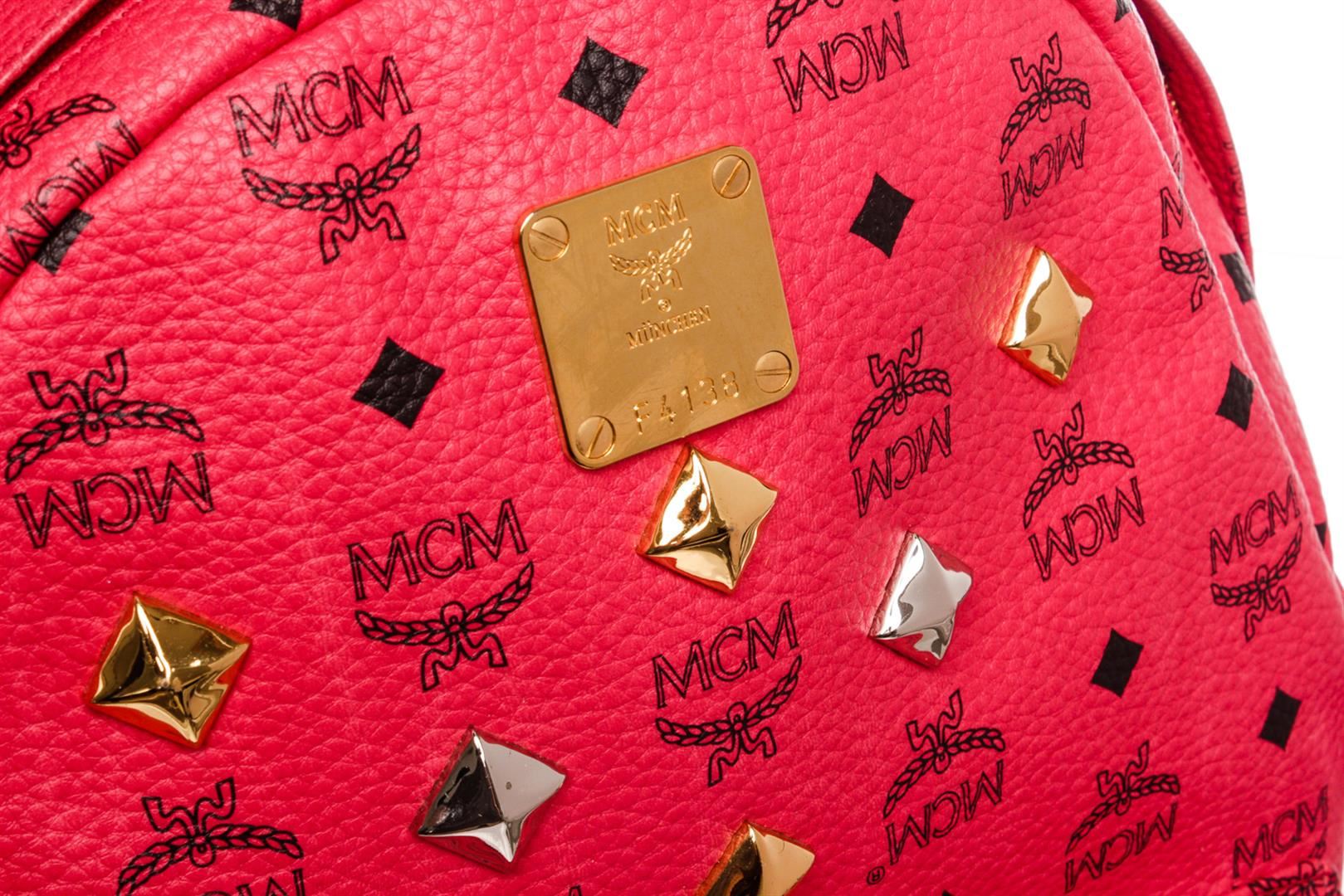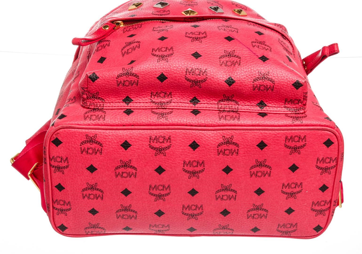 Crafted out of red visetos coated canvas and leather. This Stark MCM backpack features a large zip front pocket and zip top closure. Open it up to a tonal lining that features two side slip pockets and one zip pocket.
