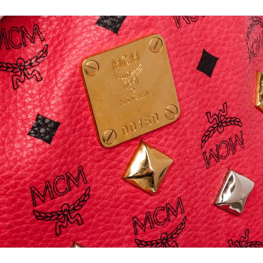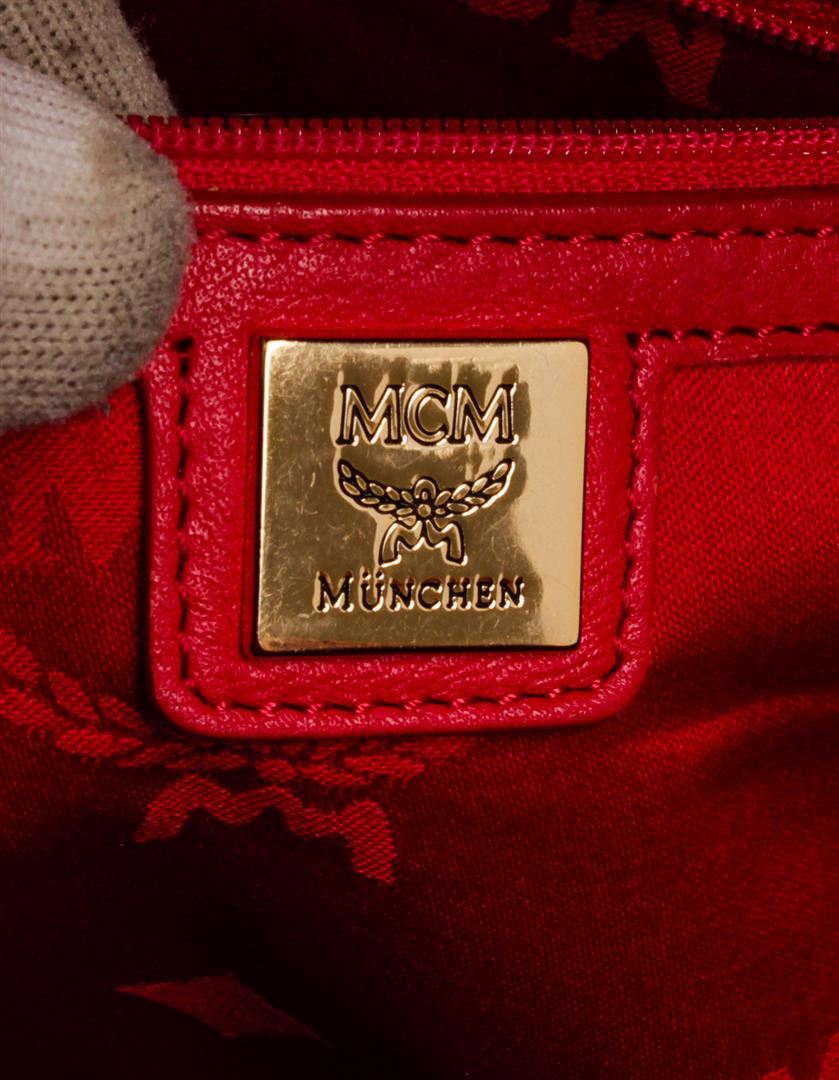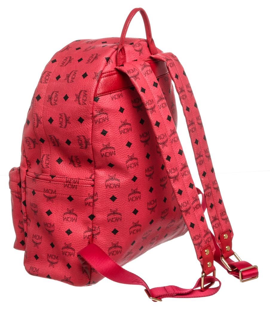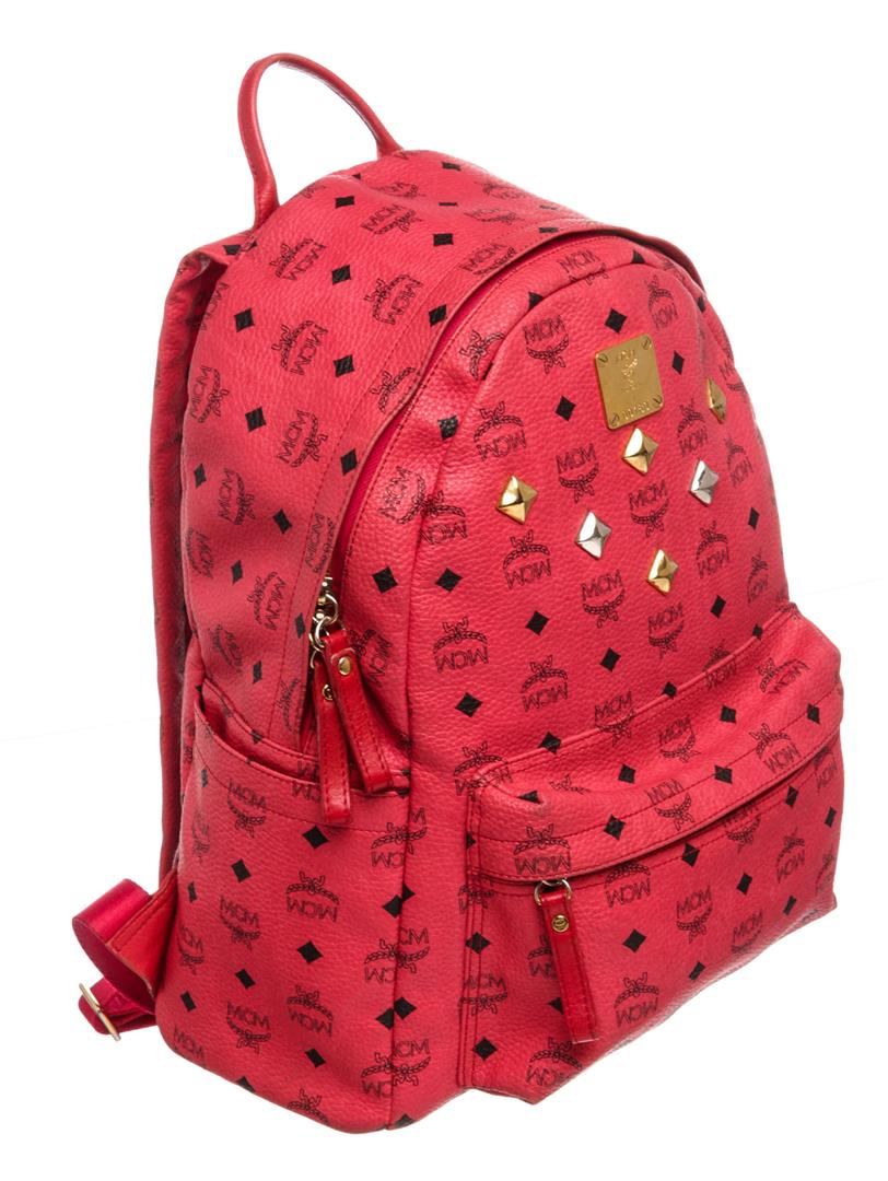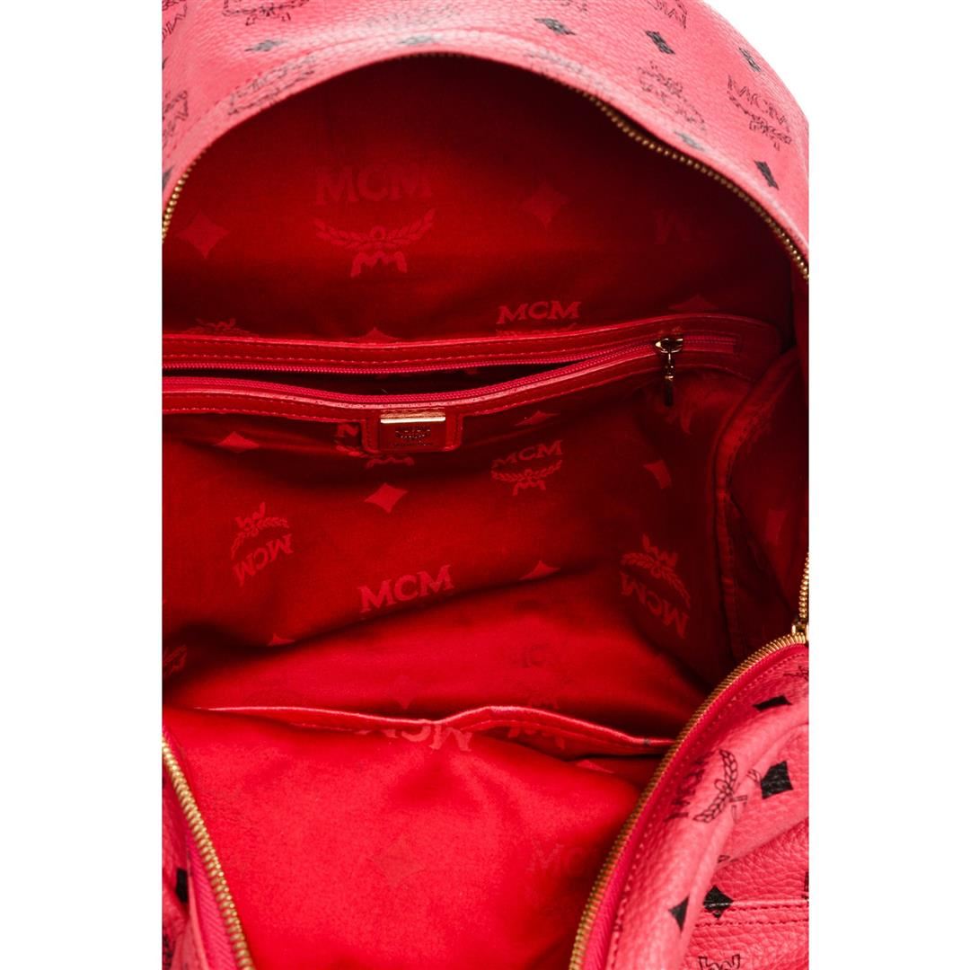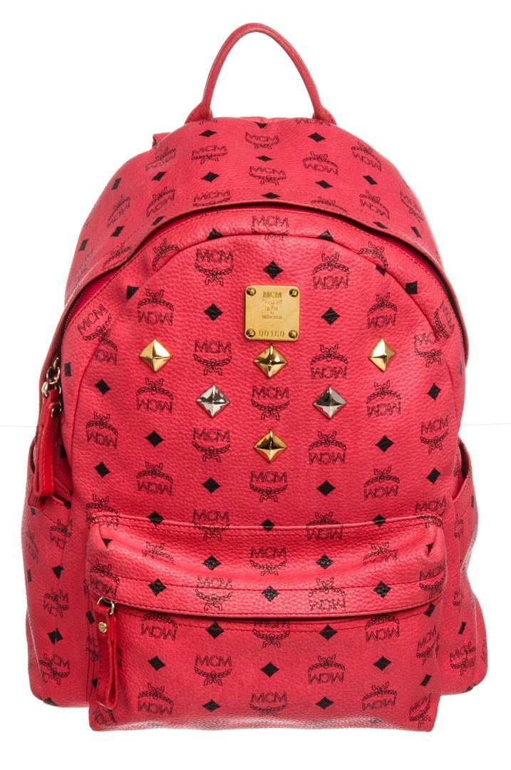 Crafted out of red visetos coated canvas and leather. This Stark MCM backpack features a large zip front pocket and zip top closure. Open it up to a tonal lining that features two side slip pockets and one zip pocket.