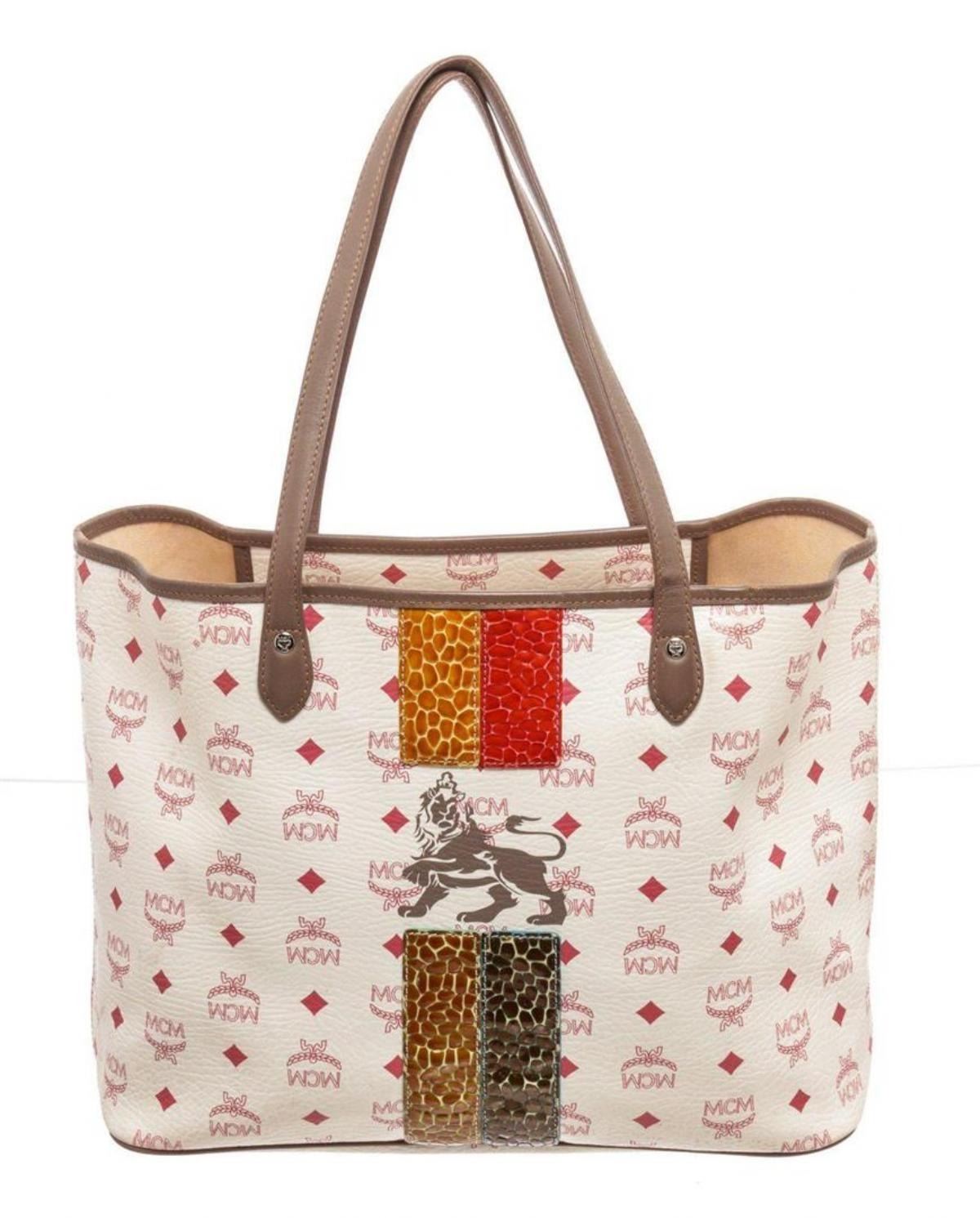 MCM Red White Lion Visetos Shopper Tote Bag. MCM Red White Lion Visetos Shopper Tote Bag with material visetos coated canvas, gold-tone hardware, interior slip pocket, dual top handle, shoulder strap and flap closure. MEASUREMENTS: Length 11 in / 28
