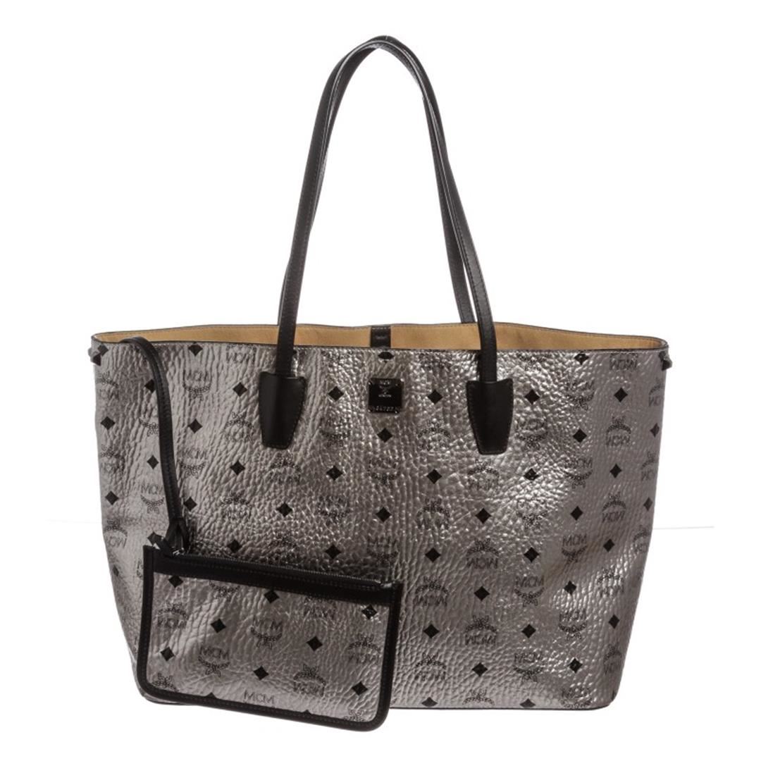 Crafted out of silver gray metallic visetos coated canvas, dual flat handles, gunmetal tone hardware. Inner beige felt lining, lobster clasp closure at top, and detachable pochette with zip top closure. Item is Pre-Owned.