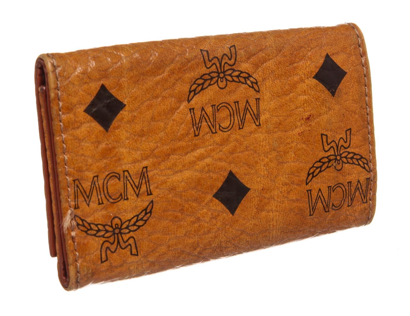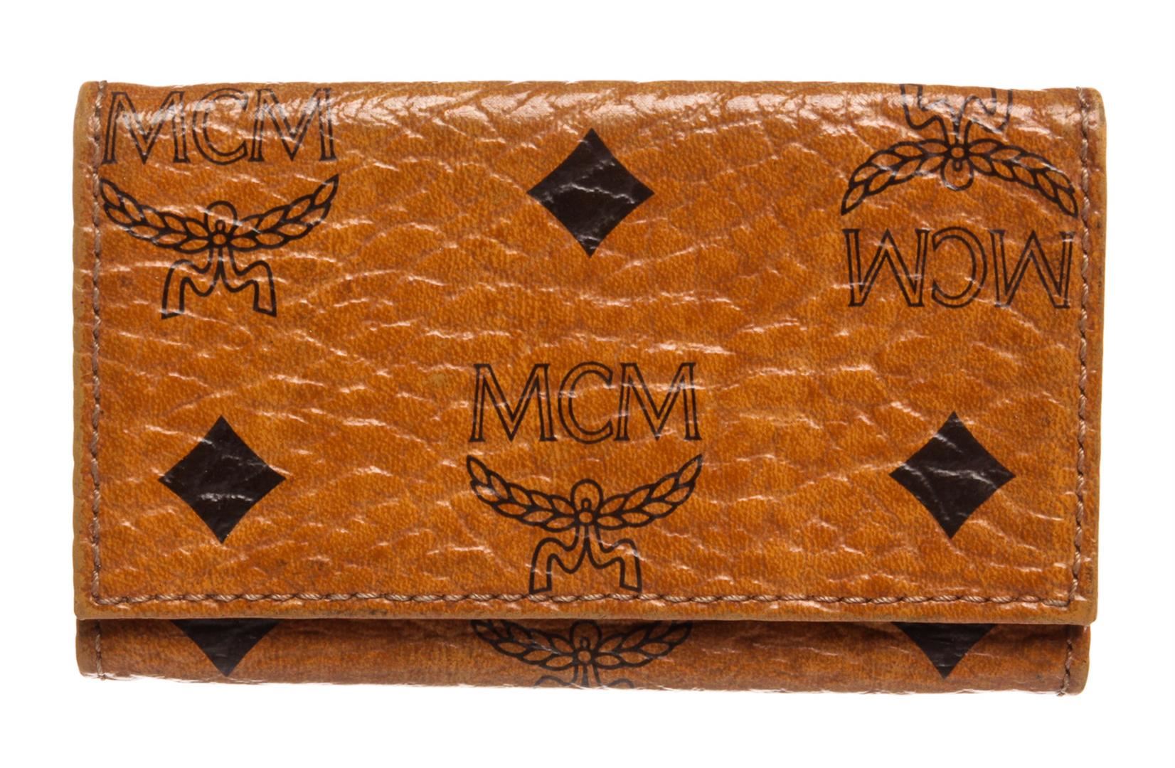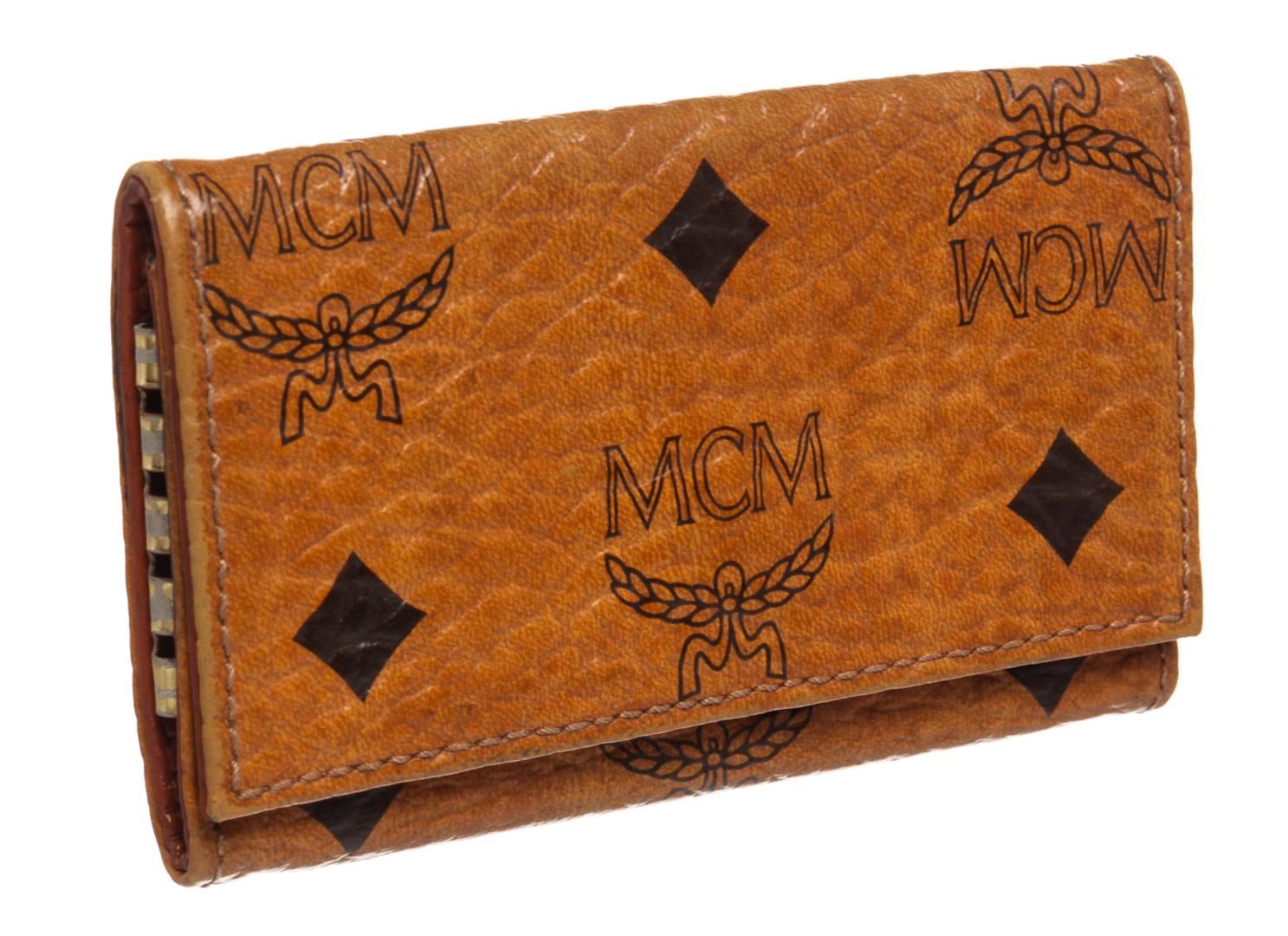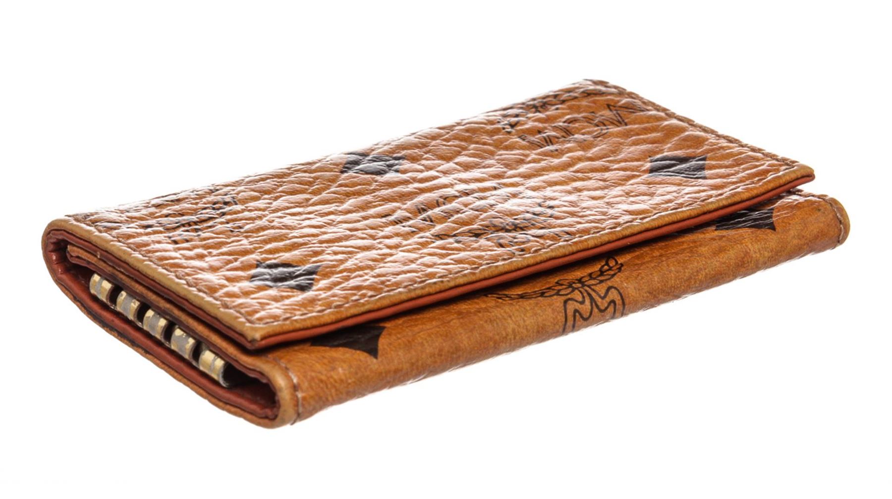 MCM tan Cognac monogram coated canvas 4 Key Holder with brown leather lining and snap closure.