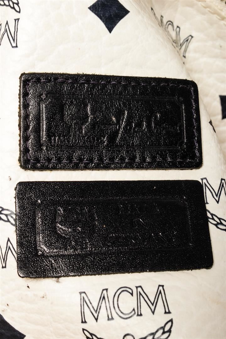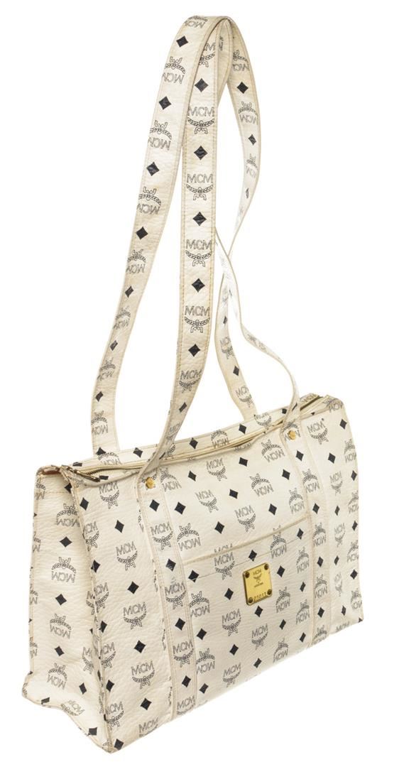 MCM Vintage Tote Bag features white Monogram coated canvas, gold-tone logo plate at front, one front pocket, main compartment with zipper closure, one pocket with zipper inside and two long shoulder straps. W15"(38cm) x H9.8"(25cm) x D5.9"(15cm), Handl