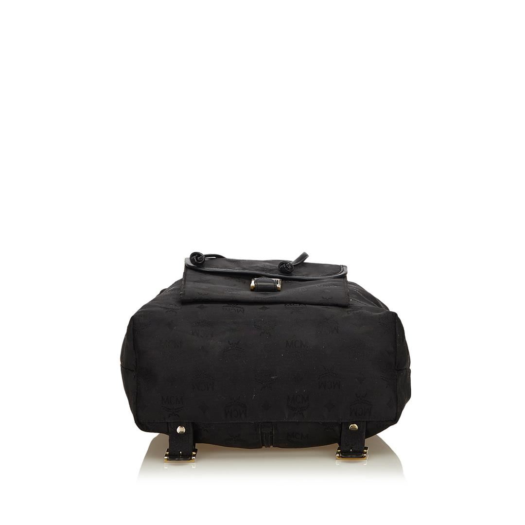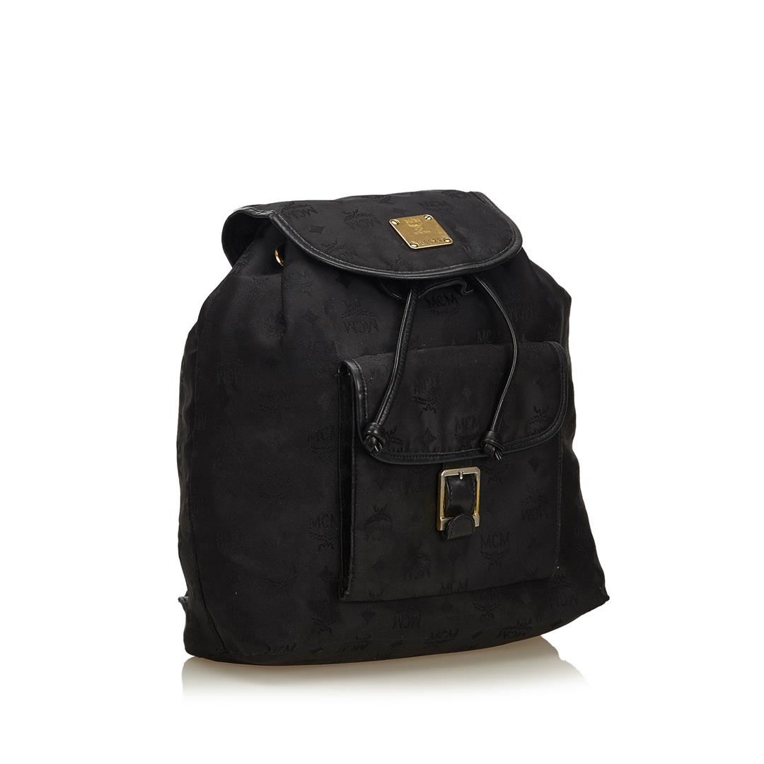 This backpack features a nylon body with leather trim, flat back straps, flat top handle, top flap with buckle closure, drawstring closure, exterior flap pockets with magnetic snap button closures and zip pocket, and interior zip pocket.