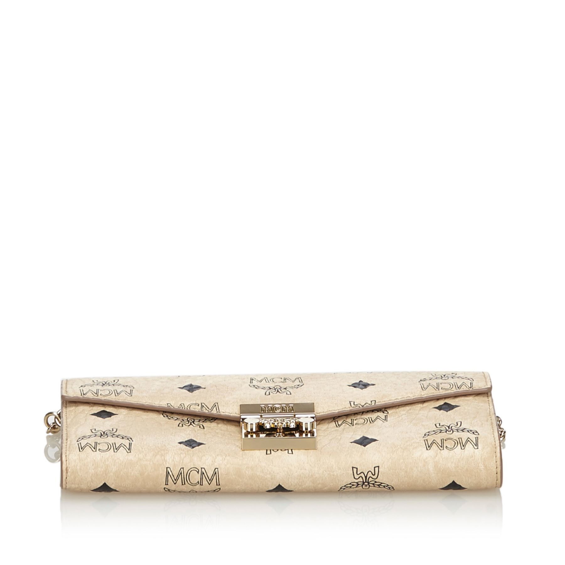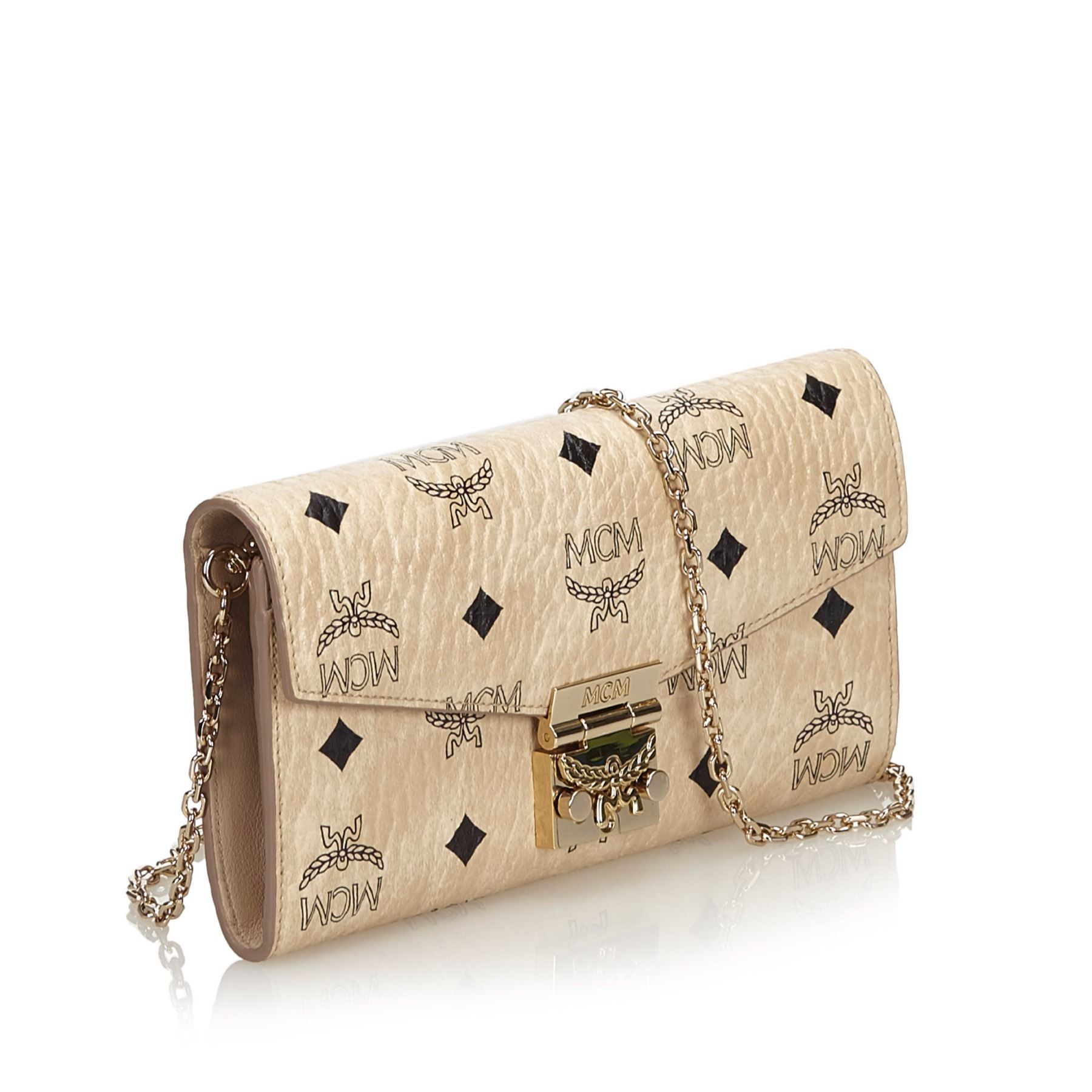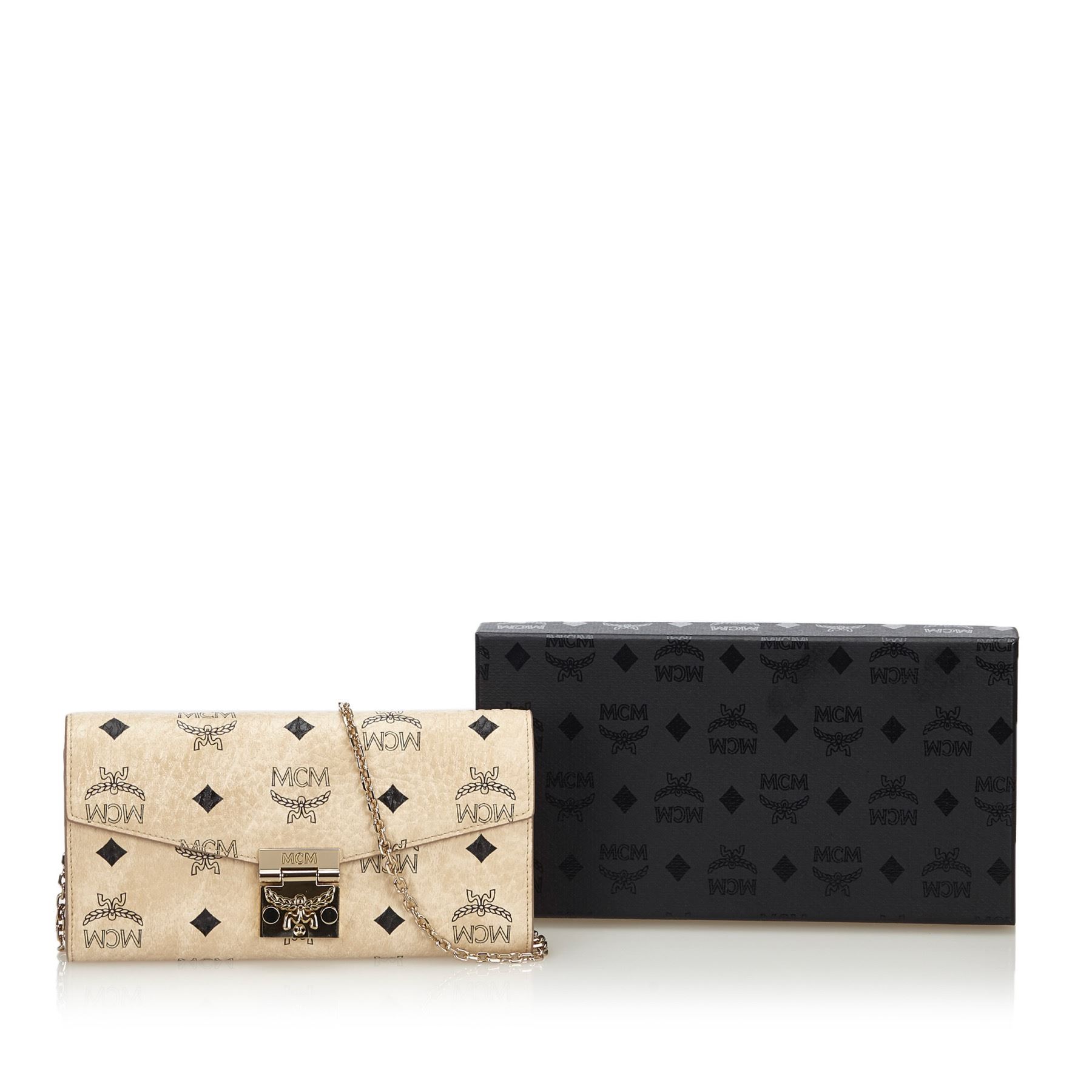 The Patricia wallet on chain features a coated canvas body, a silver tone chain strap, a front flap with a metal lock closure, and interior zip and slip compartments. Fabric x Coated Canvas x Metal x Others White x Black Buckle is scratched. Size: 10 x 19 x 0 Card: NO Made in: Germany